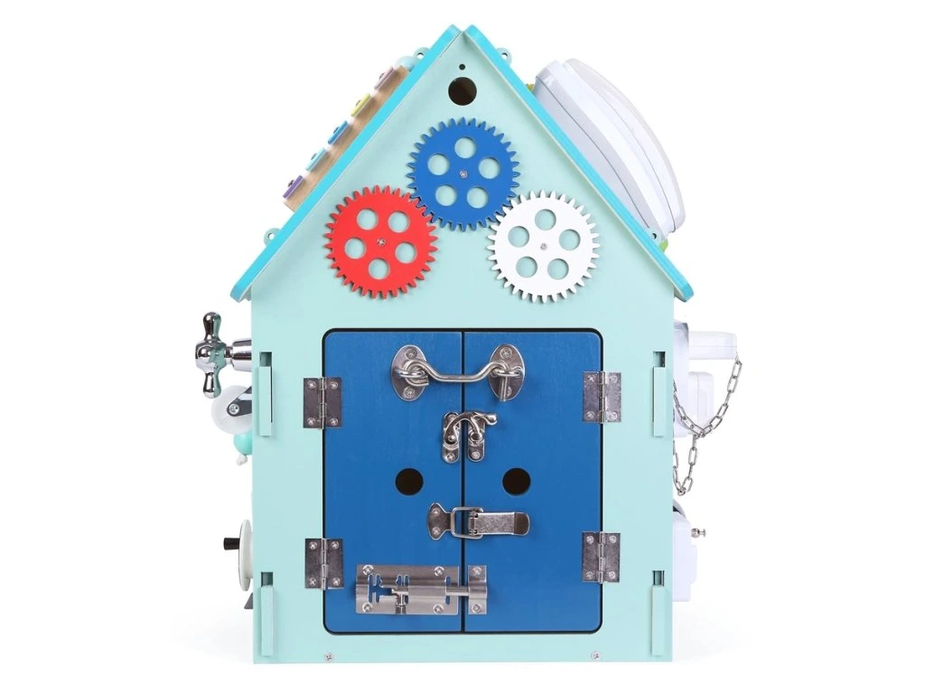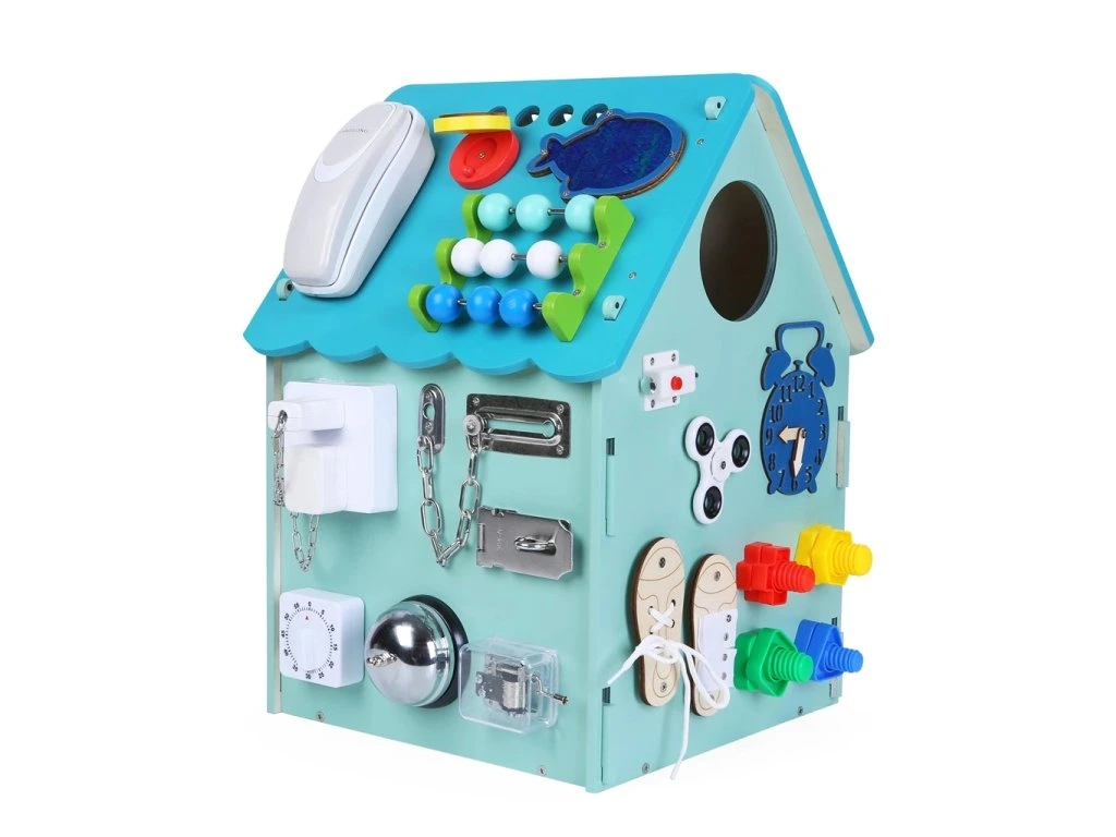 Kromě senzorických aktivit obsahuje i edukační prvky jako počítadlo a hodiny, které podporují učení hrou. Barva domečku na fotografii je ilustrační, ve skutečnosti se tyrkysové odstíny mohou mírně lišit.