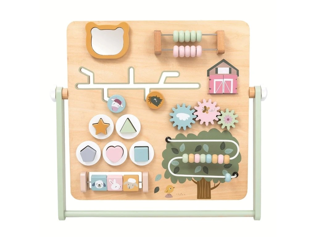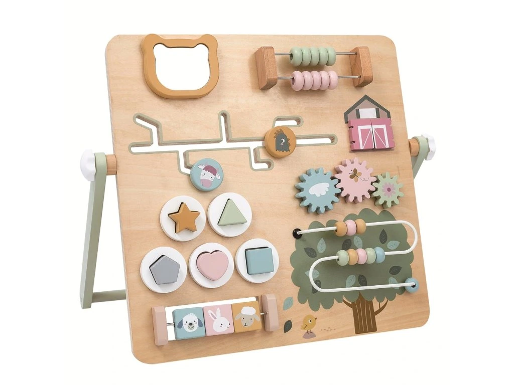 Dřevěná hrací deska nabízí bohatou škálu interaktivních prvků, jako jsou otočná ozubená kolečka, posuvný a korálkový labyrint či vkládací tvary. Všechny prvky motivují děti k prozkoumávání, učení a hře.