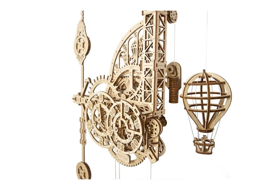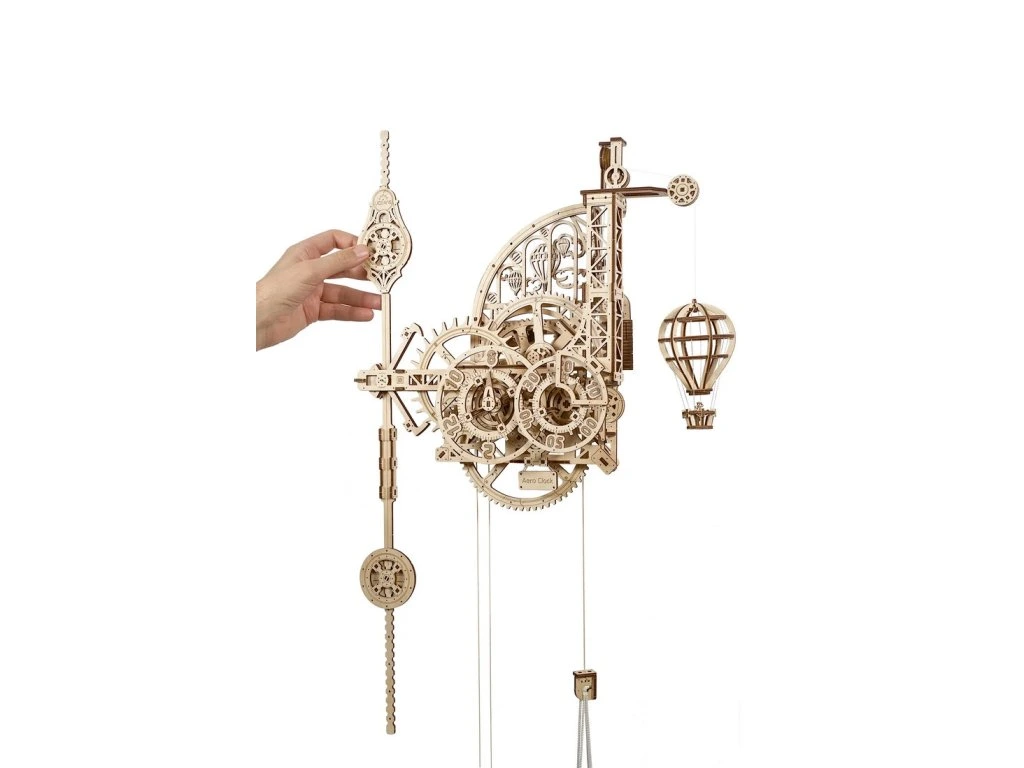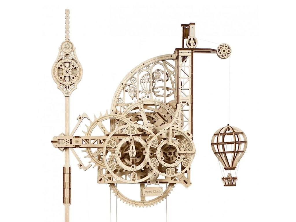 Tento jednoduchý, a přece elegantní model hodín od Ugears je poháněn silou gravitace, která táhne dolů závažný vak (můžete ho naplnit pískem nebo solí). Zdvižením vaku na kladkách natáhnete hodiny. Když se závaží pomalu spouští, otáčí hnacím kolečkem, které potom otáčí únikovým kolečkem prostřednictvím reduktoru. Hodiny mají nastavitelné kyvadlo, které interaguje s únikovým kolečkem prostřednictvím stabilního tik-tak kotevního mechanismu. Tikání hodín můžete upravit po sekundách posunutím horního a dolního závaží na kyvadle. Reduktor také přenáší otáčení na hodinový a minutový kotouč. Jednou ze zajímavostí našich Aero Clock je, že čas se nečte pomocí otáčejících se ručiček na ciferníku, ale pevná ukazovátka ukazuje čas na pomalu se otáčejících číslovaných hodinových a minutových kotoučích. Navíc, tyto kotouče se otáčejí proti směru hodinových ručiček – věděli jste, že před standardizací se některé hodiny pohybovaly ve směru hodinových ručiček a jiné proti němu? V roli "kukačky" mají Aero Clock model horkého vzdušného balonu, který se při každé celé hodině rychle spustí dolů, a potom se během následující hodiny pomalu zdvíhá.