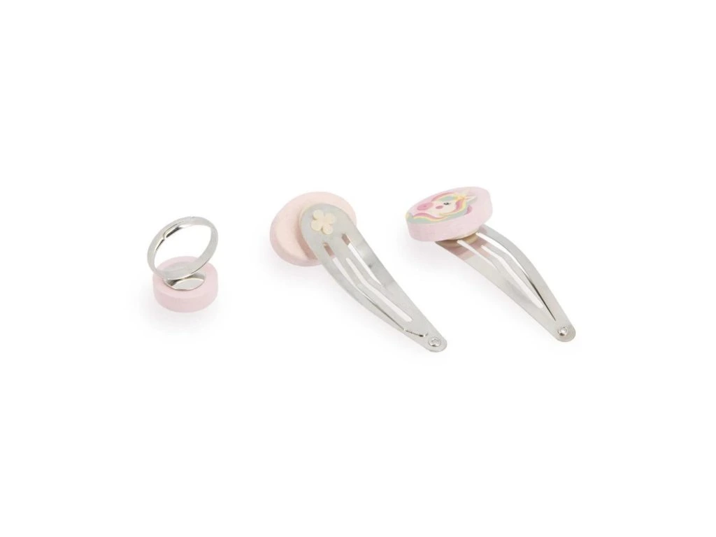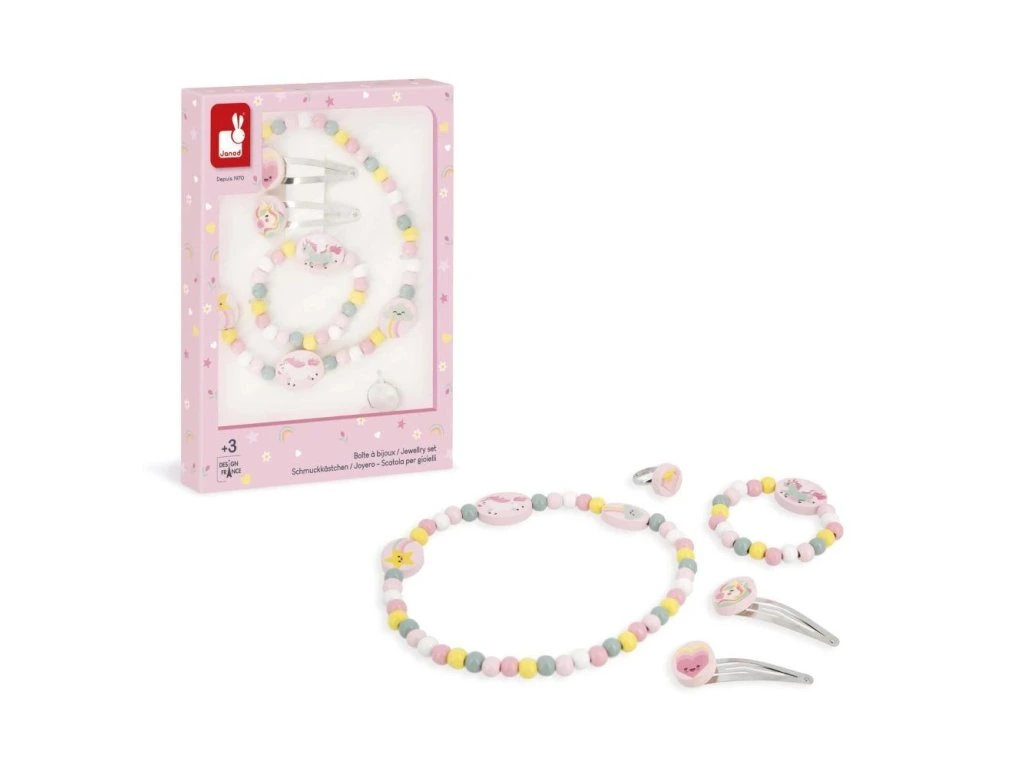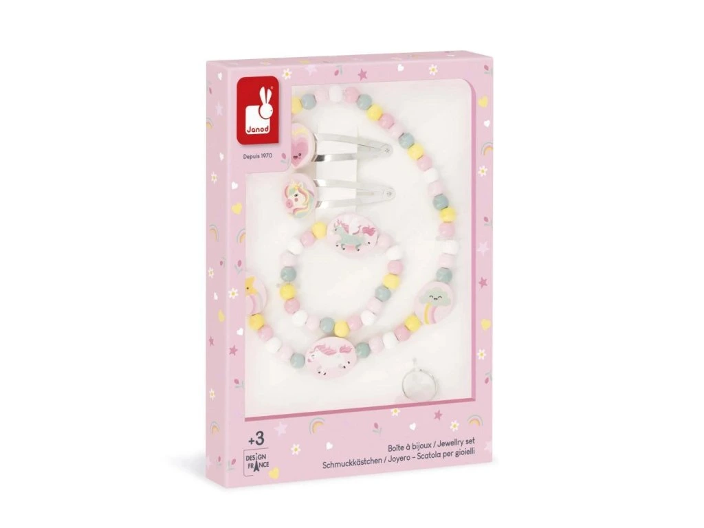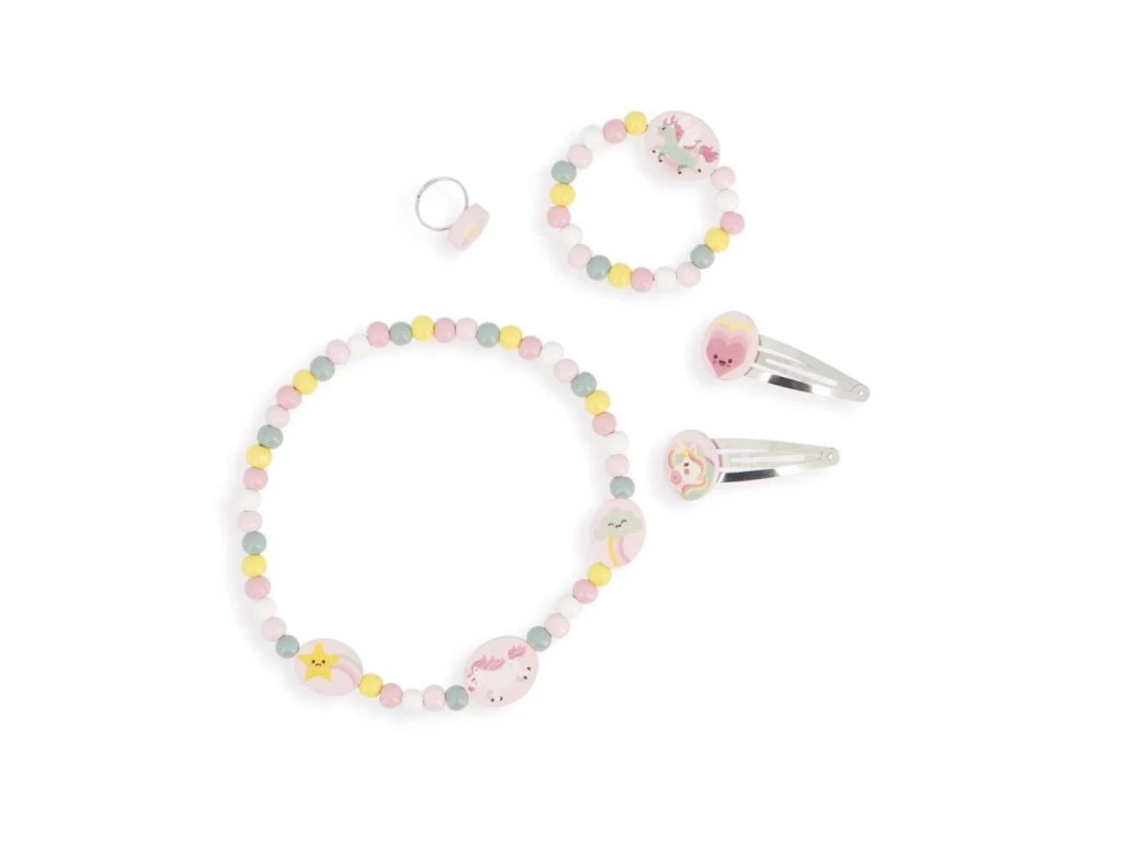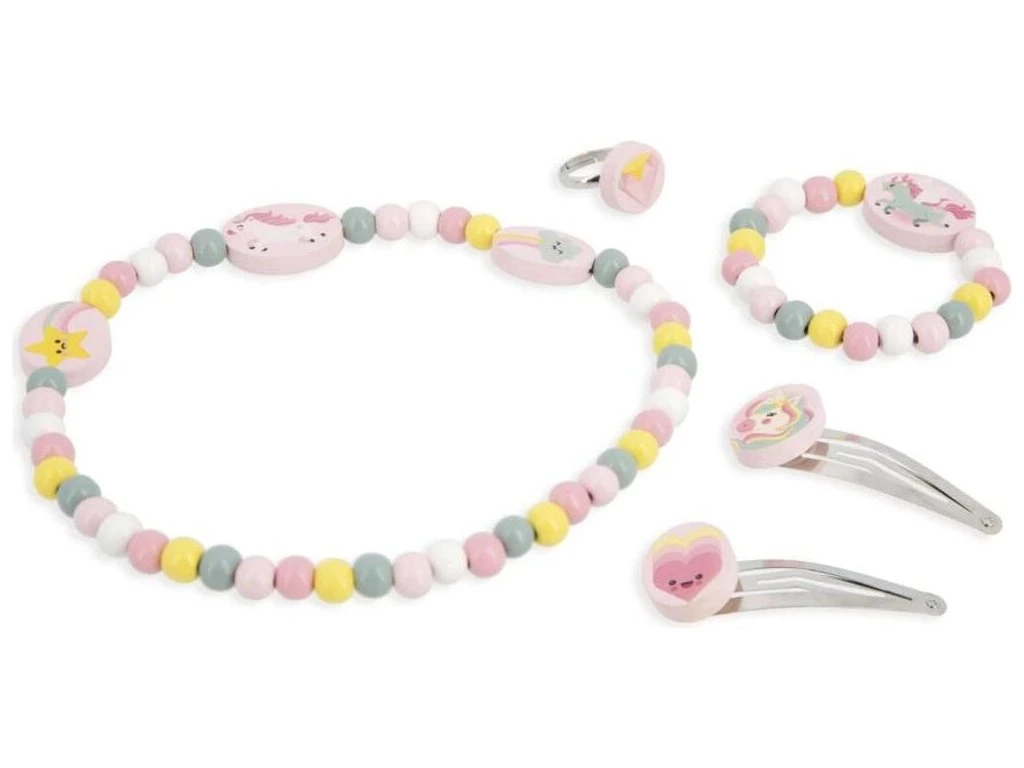 Dodejte dětskému outfitu šmrnc s touto kouzelnou soupravou šperků s jednorožcem!Tato rozkošná souprava je ideální pro malé parádnice od 3 let. Obsahuje náhrdelník, náramek, prsten a dvě spony – vše s krásným motivem jednorožce. Celkem 5 dřevěných šperků, které se dokonale hodí k účesu i outfitu a umožňují dětem vyjádřit svou osobnost, styl a vkus.