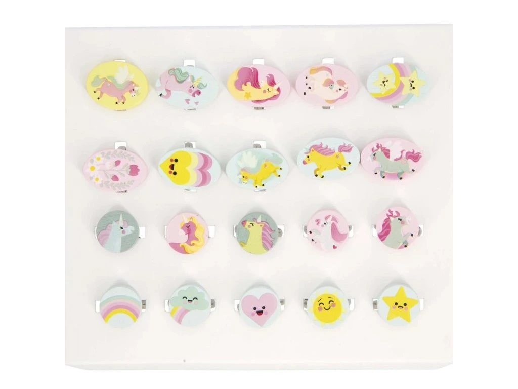 - 20 dřevěných prstenů s motivem jednorožce (10 kulatých, 10 oválných)
