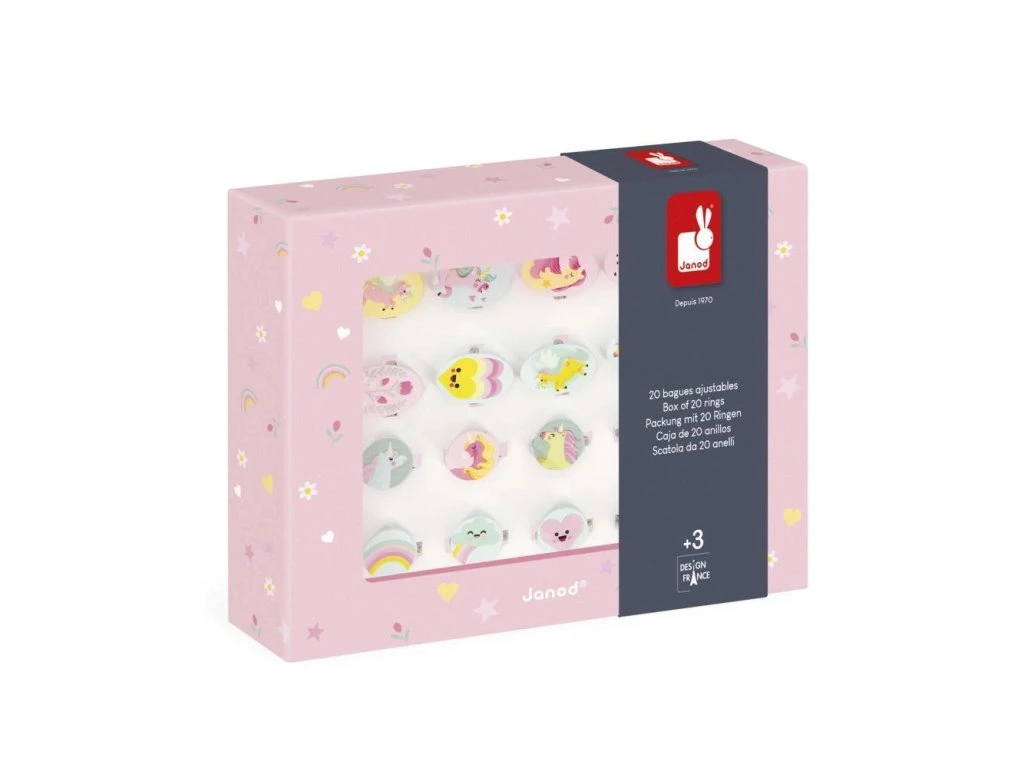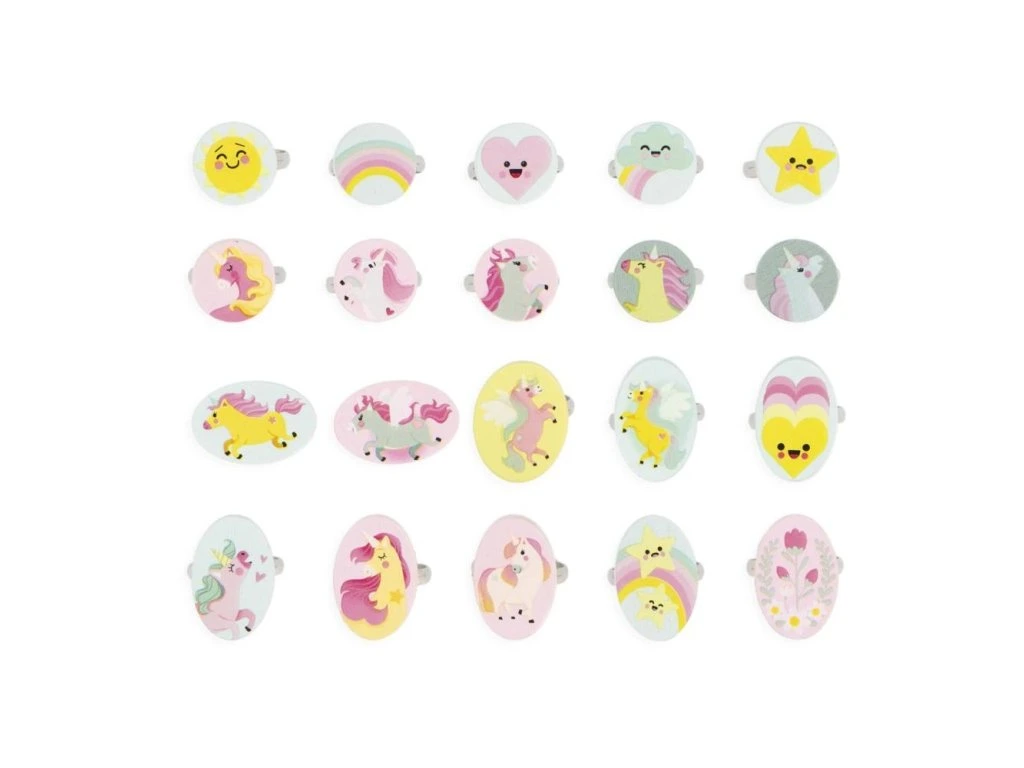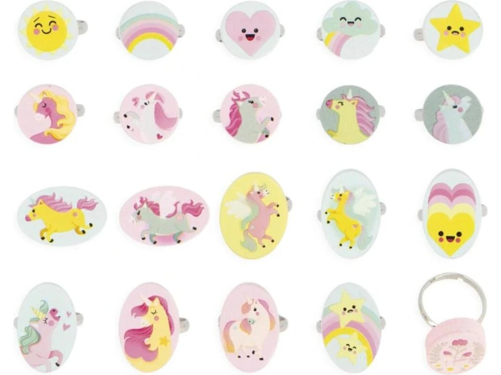 Na večírku s kamarády můžete darovat prsten všem hostům nebo jednoduše potěšit nejlepší přátele rozkošným dárkem. Krásné barvy a poetické ilustrace s motivy jednorožců, duh, hvězd a srdíček vytvářejí očarující vzhled a zvyšují sebevědomí. Praktická krabička je skvělá i na uskladnění celé sbírky prstenů.