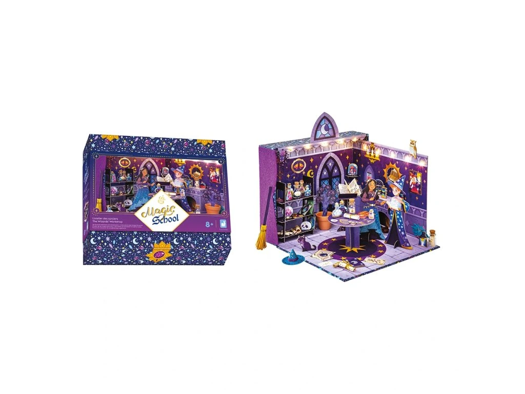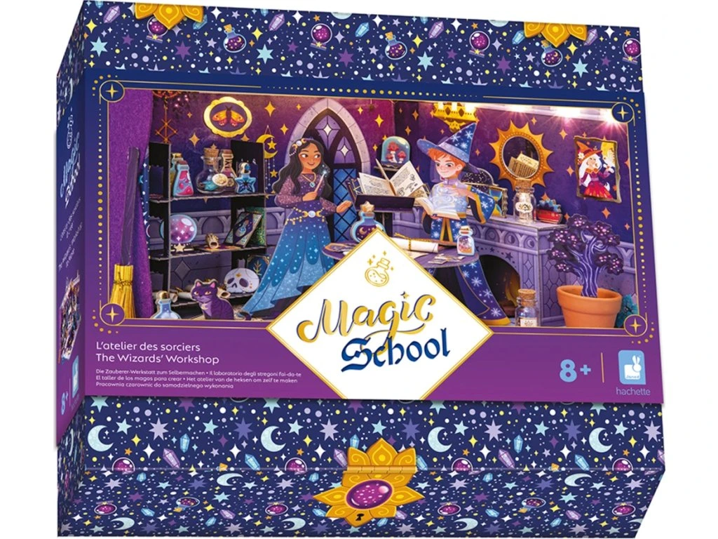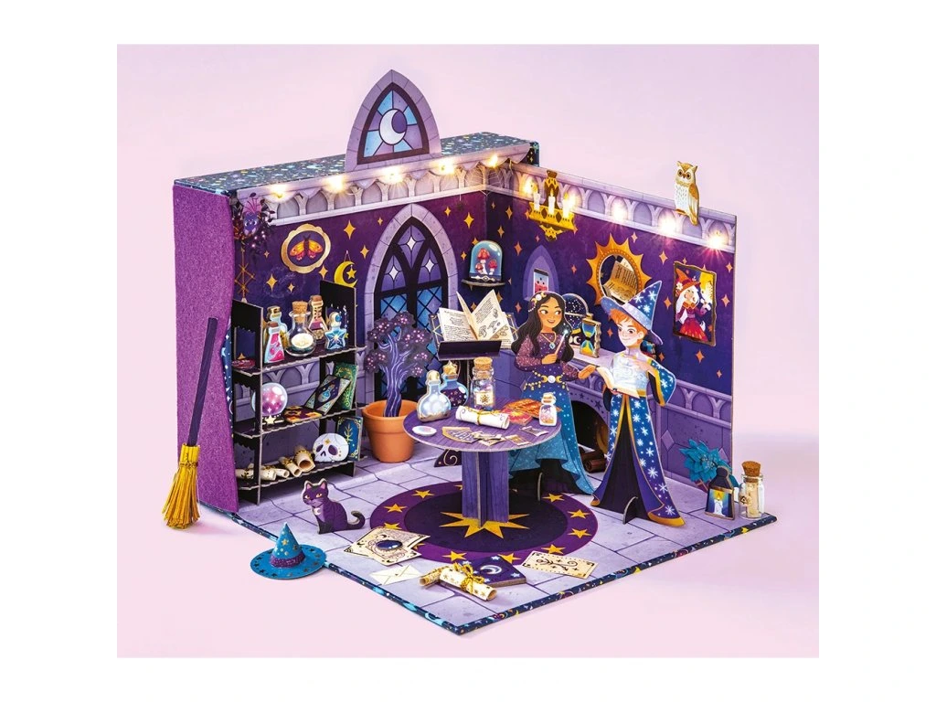 Starobylé pergameny, tajemné ampulky, létající koště… Čarodějnice vítá svého kamaráda kouzelníka, aby spolu pracovali na mocném kouzle. Pod rukama dětí ožije minisvět plný fantastických stvoření, hvězd a elixírů. Výhodou stavebnice je pevná krabice, která umožňuje nastavit scénu – zbývá už jen sestavit nábytek a postavy.