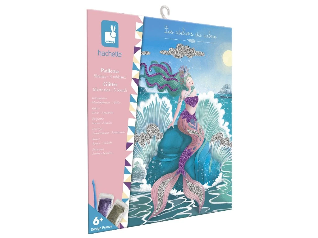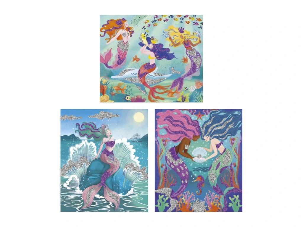 Na mořském dně... Tato sada na tvoření umožňuje ozdobit 3 obrázky mořských panen třpytkami!