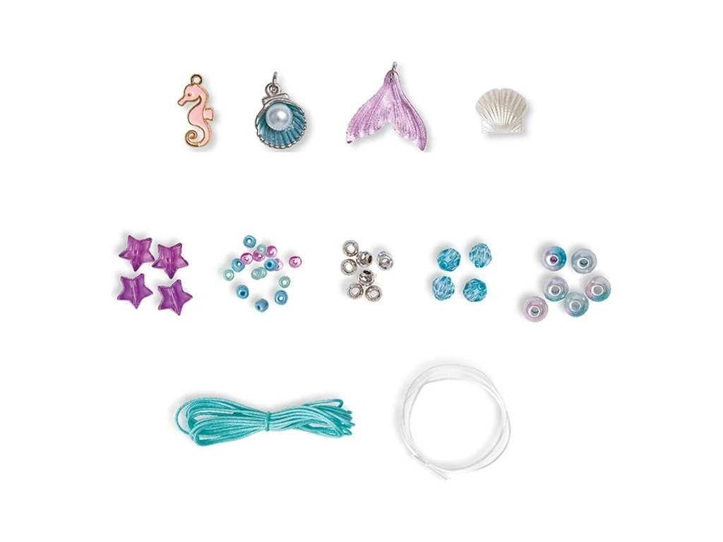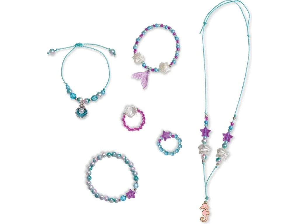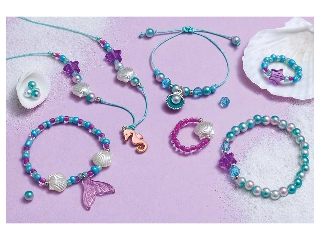 Vytvořte šperky inspirované magií hlubokého moře! S touto sadou na výrobu šperků mohou děti vyrobit 6 výtvorů na téma mořské panny: 2 prsteny, 3 náramky a 1 náhrdelník. Tyto šperky se svým podmanivým šarmem a perleťovým efektem ponoří nejmenší do nádherného podmořského světa. Výrobou vlastních šperků z mořské panny děti rozvíjejí svou kreativitu i jemnou motoriku.
