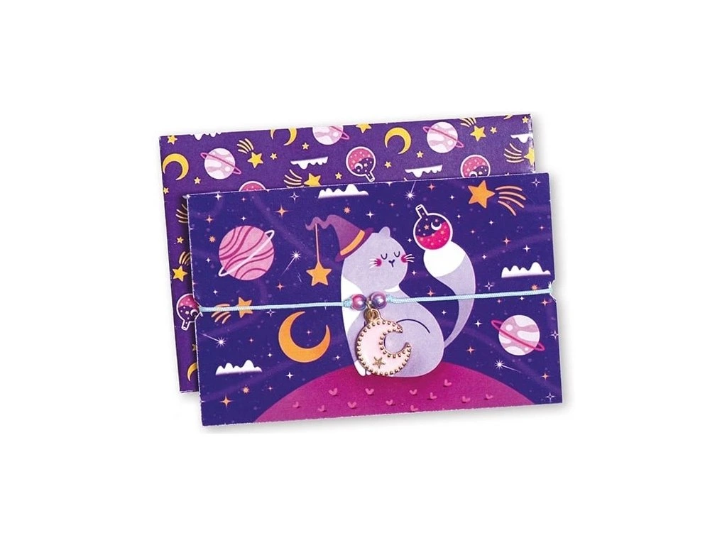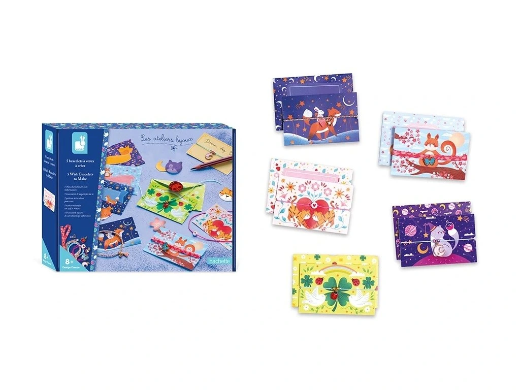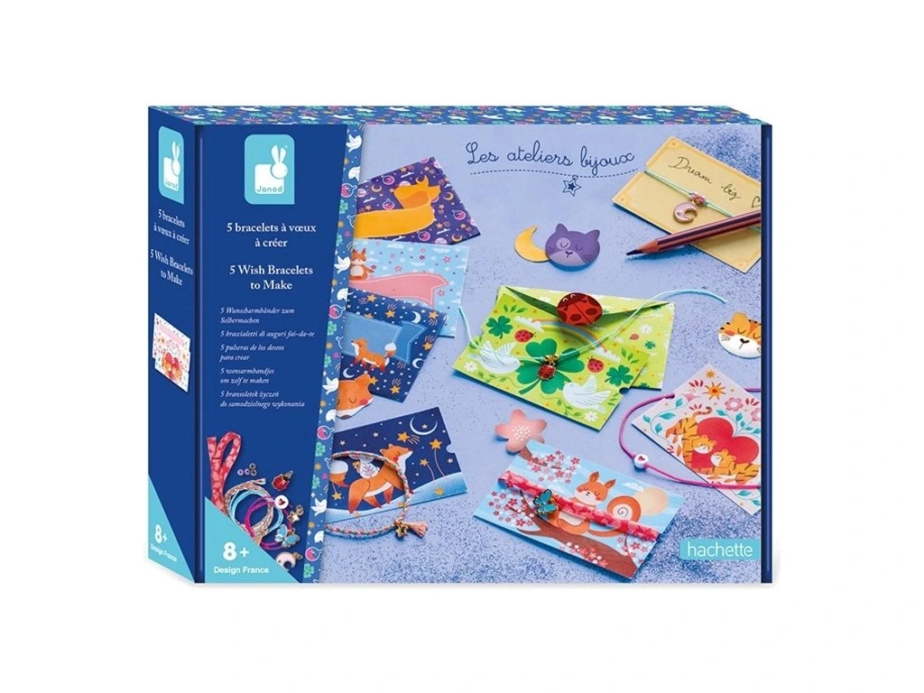 Něco si přejte! S touto soupravou na vytváření náramků si mohou děti ve věku 8 a více let vyrobit vlastní šperky, které si ponechají nebo dají jako náramky přátelství. Princip? Přejte si tak, že náramek uzavřete zauzlovanými články, a když se rozepnou, přání je splněné! Malí kreativní lidé mohou nabídnout svých 5 náramků svým blízkým, aby jim popřáli štěstí, přátelství nebo dokonce kouzlo.