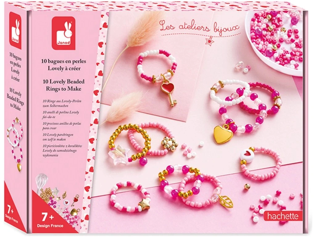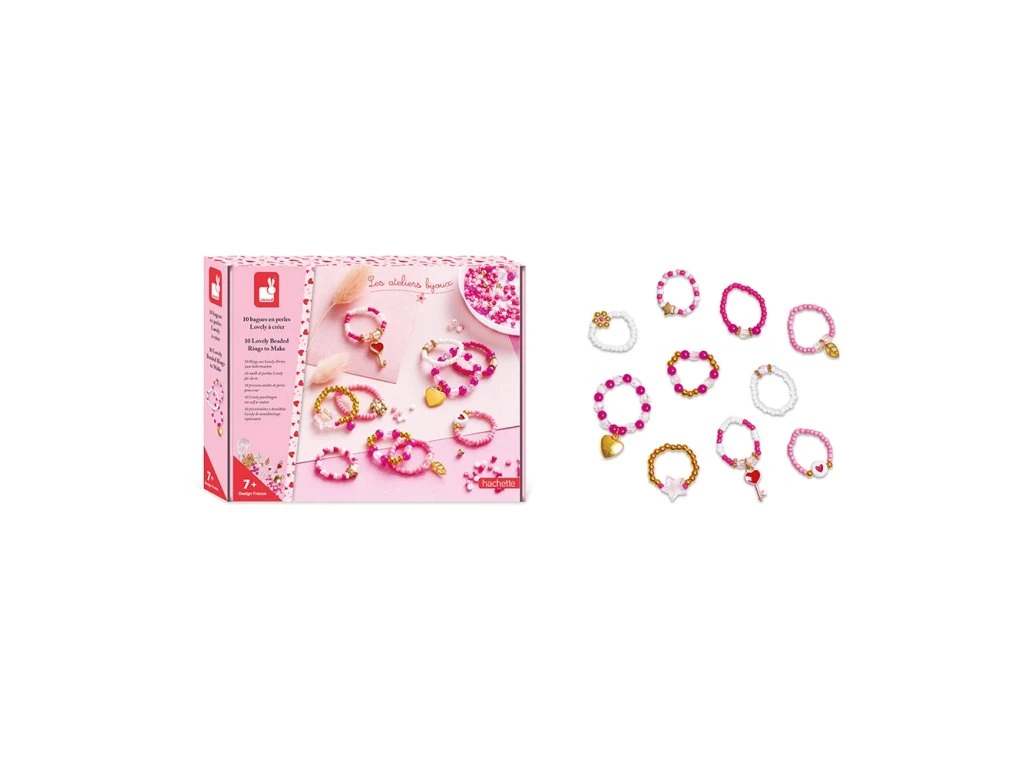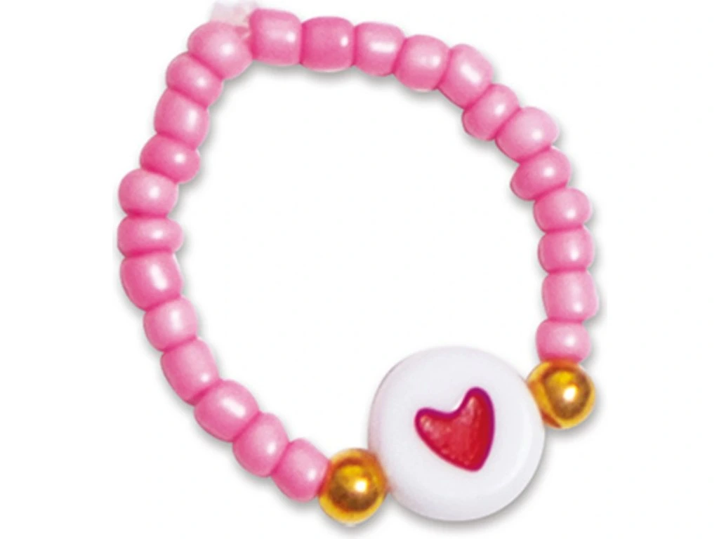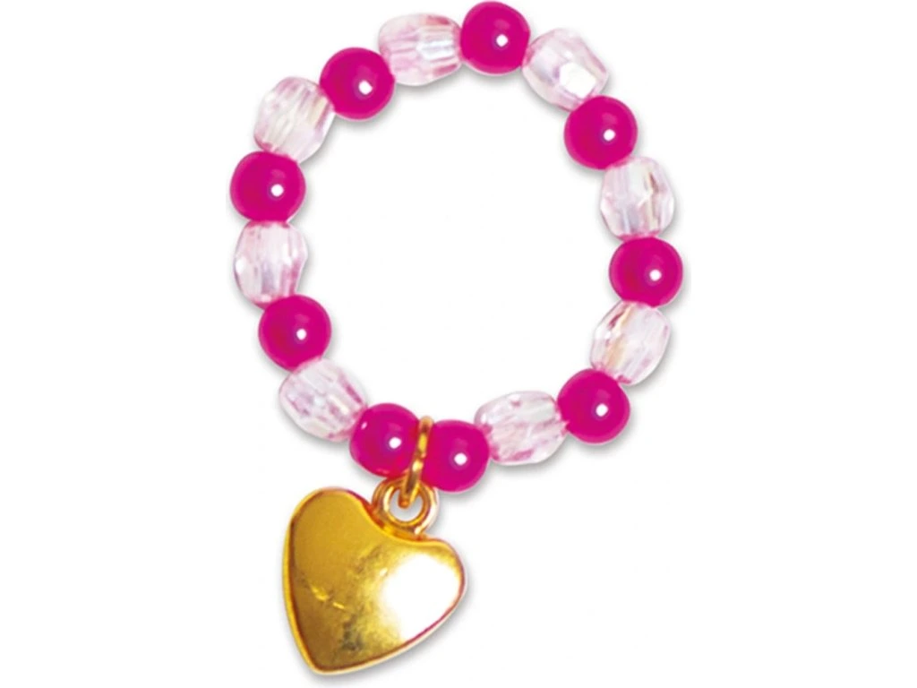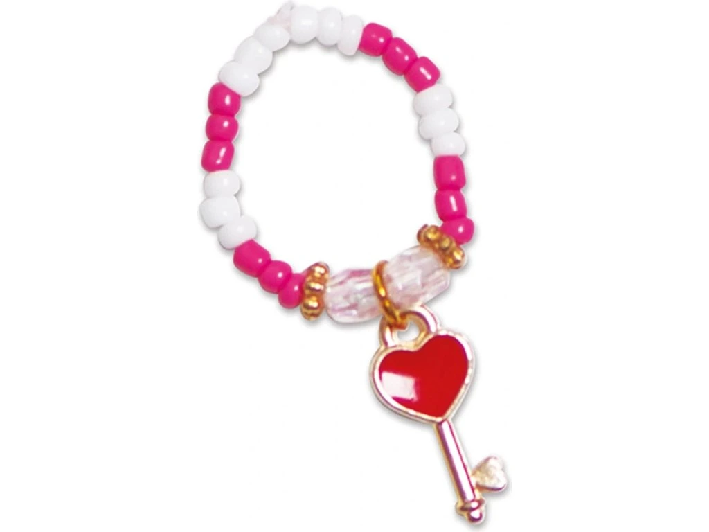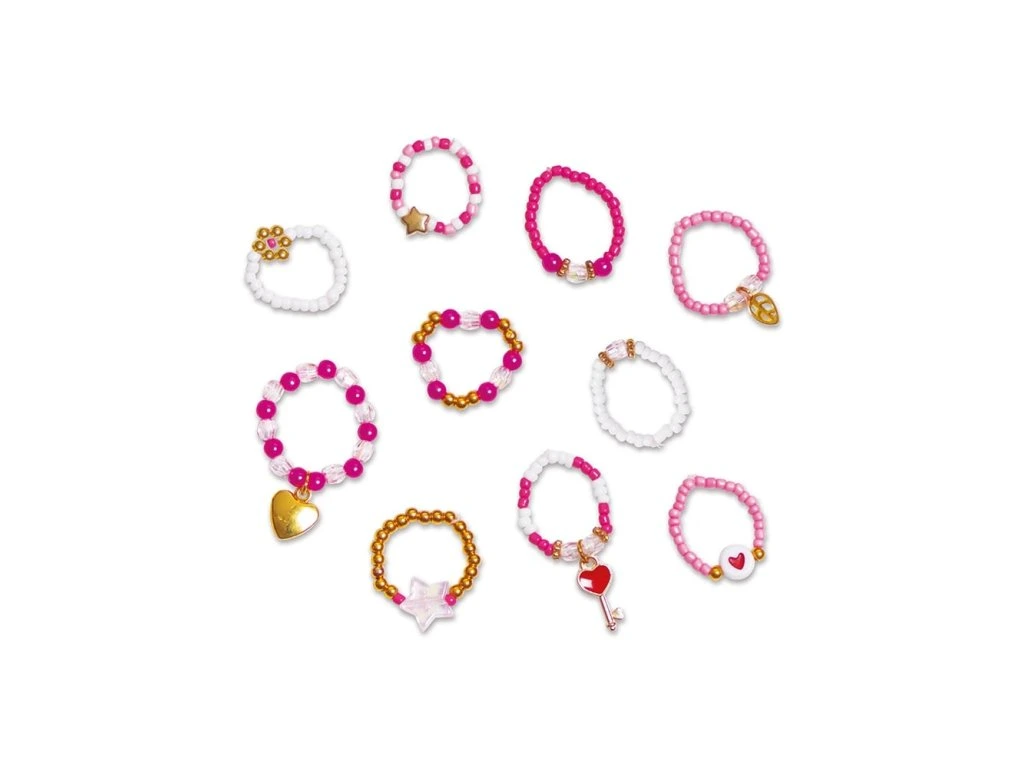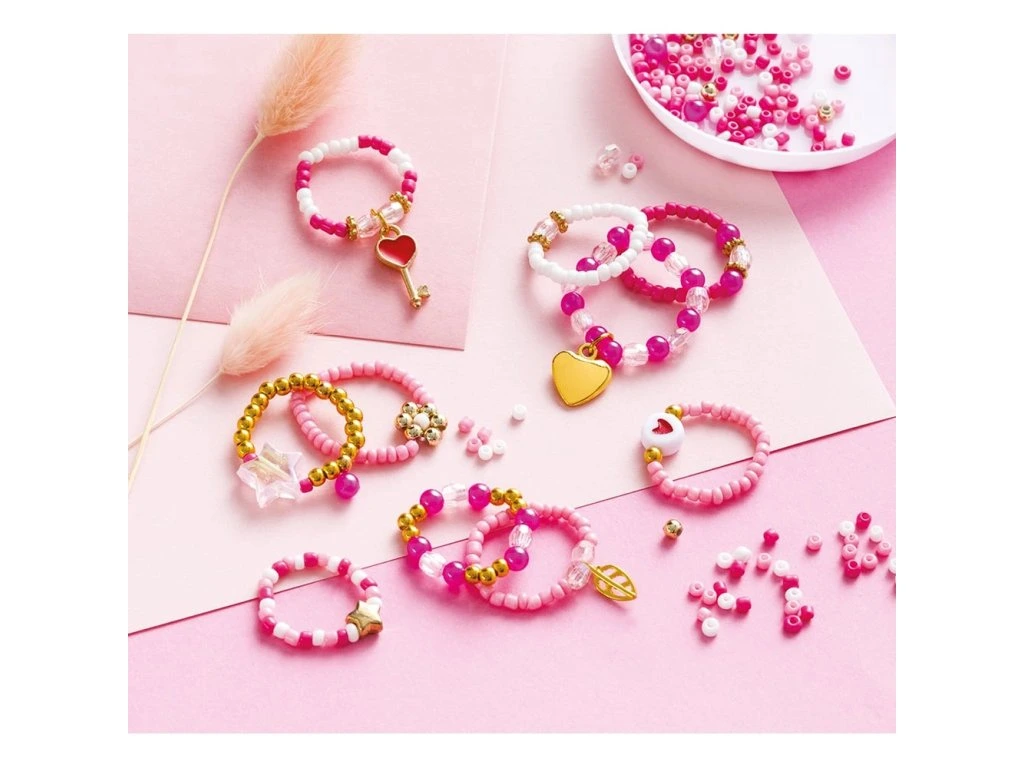 Kolekce nádherných prstenů! Tato kreativní souprava vám umožní vyrobit 10 krásných korálkových prstenů: růžové, červené, s motivy srdíček a další.