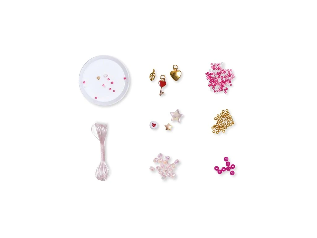 Kreativní souprava: Výroba 7 kusů šperkůTato souprava umožňuje dětem vytvořit 7 šperků: 2 náramky, 1 náhrdelník, 1 pár náušnic a 3 prsteny.
