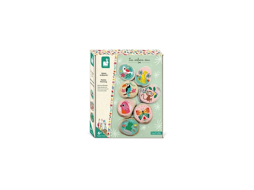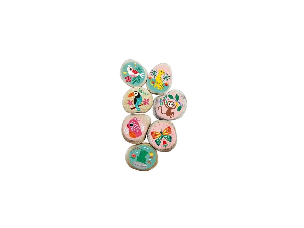 7 kamínků na malování 1 arch nálepek, 1 dřevěná tyčinka, 2 nádobky s barvami, 1 štětec a 1 brožura s pokyny a obrázky. Tato aktivita rozvíjí: motorikuKamínky rozměr : 4 x 6 x 2 cm.