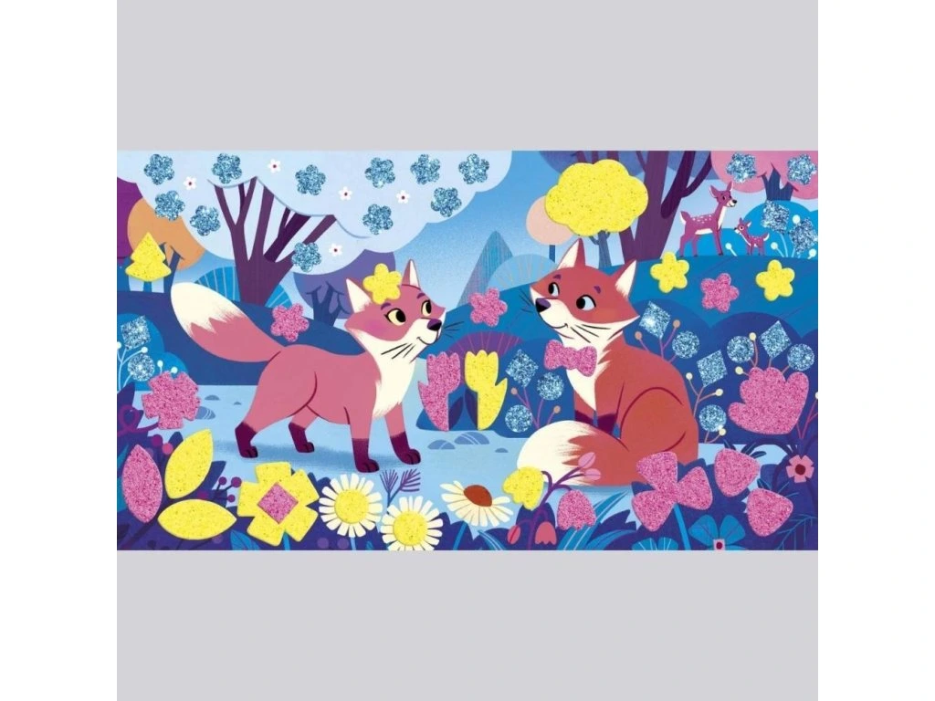 Objevte kouzelný svět lesních zvířátek! Obsahuje 3 desky-obrázky (20,7 x 11,8 cm), zobrazující setkání lesních zvířátek. Ilustrace je možné na vhodných místech ozdobit fluorescenčním pískem (růžovým nebo žlutým) a pěnovými nálepkami. Zdobení pískem a nalepování nabízí dětem hodiny poutavé, uklidňující a tvořivé zábavy a hotové obrázky se stanou skvělým dekorativním prvkem dětského pokoje.
