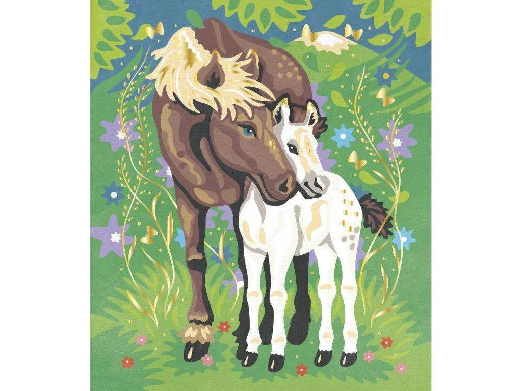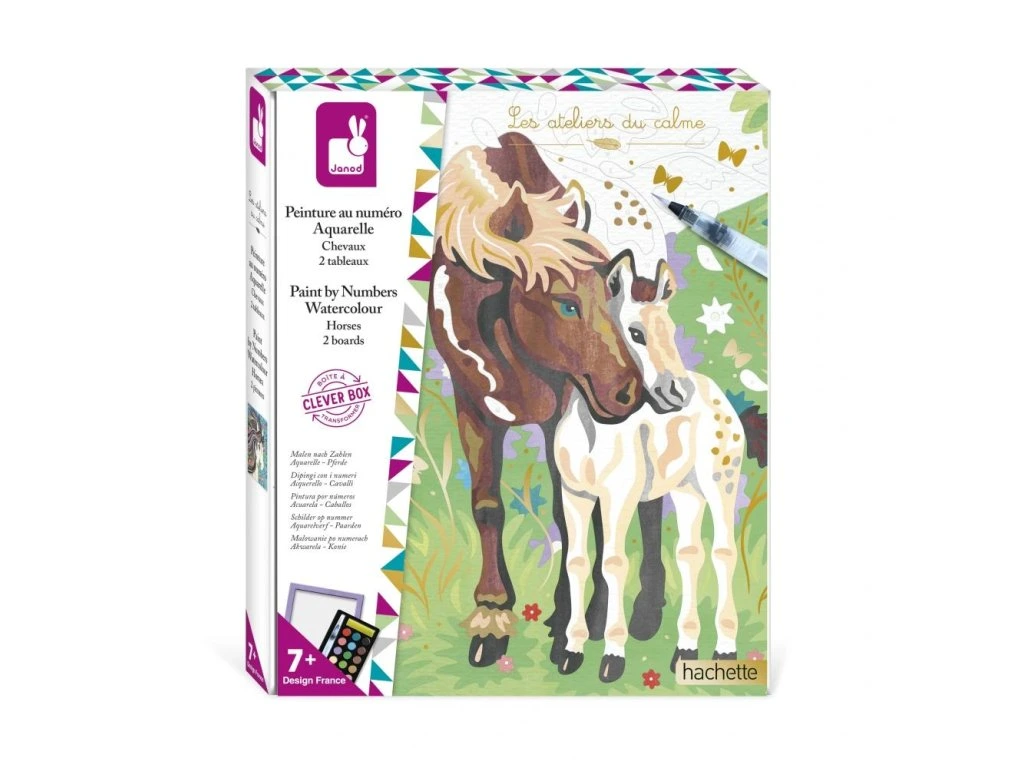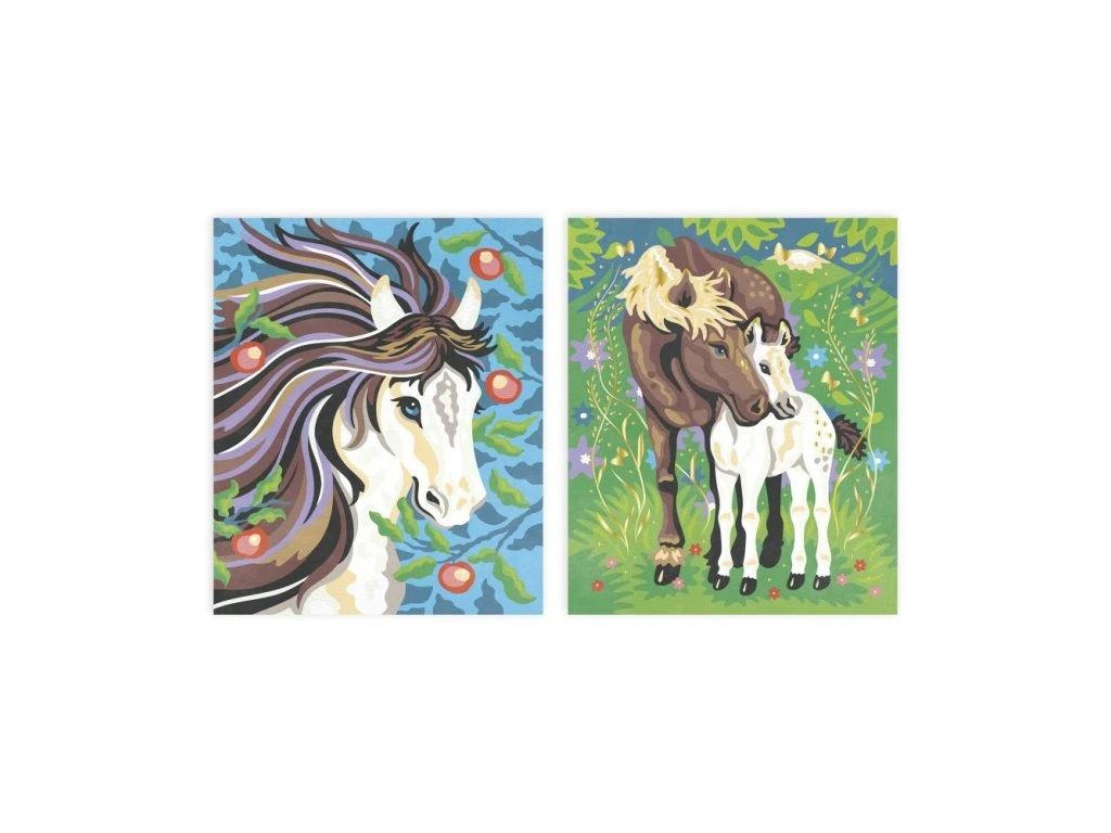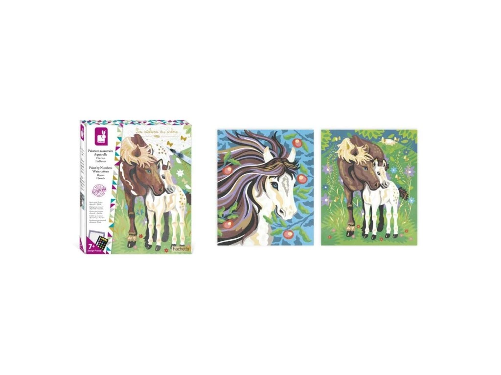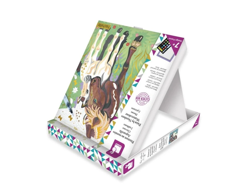 Tato vzrušující kreativní aktivita umožňuje dětem od 7 let vytvářet krásné malby akvarelovými barvami, jednoduše podle pokynů. Sada obsahuje 2 obrázky, na prvním je klisna a její hříbě, na druhém nádherný kůň.