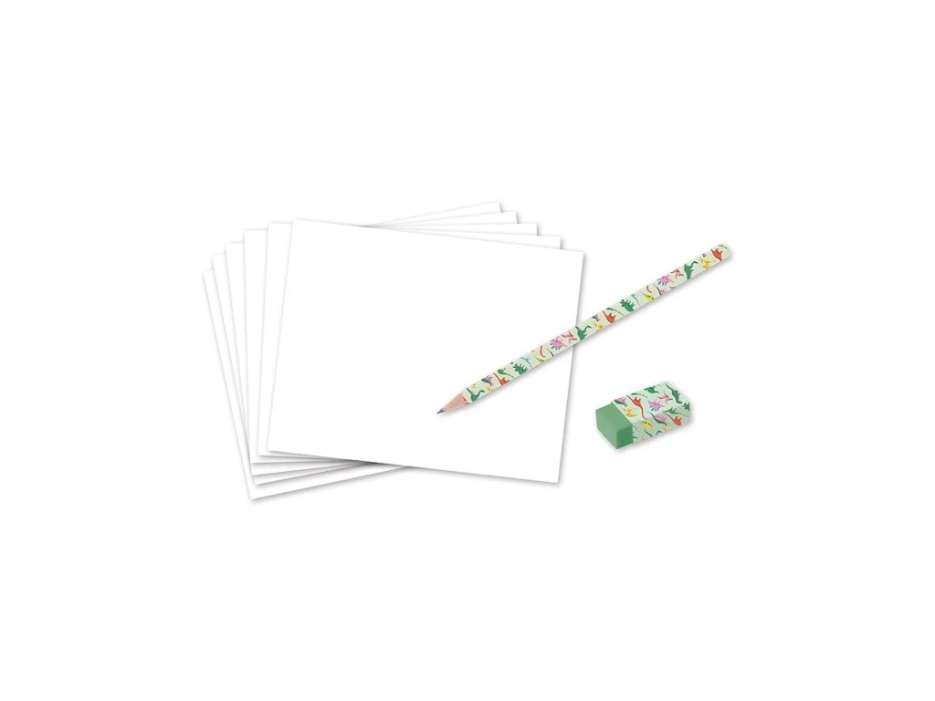 Obsah sady: 20 destiček se vzory, 25 čistých listů papíru, tužka HB, guma