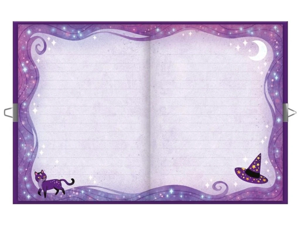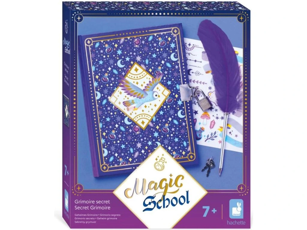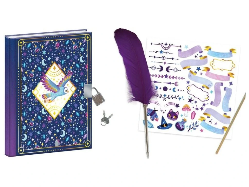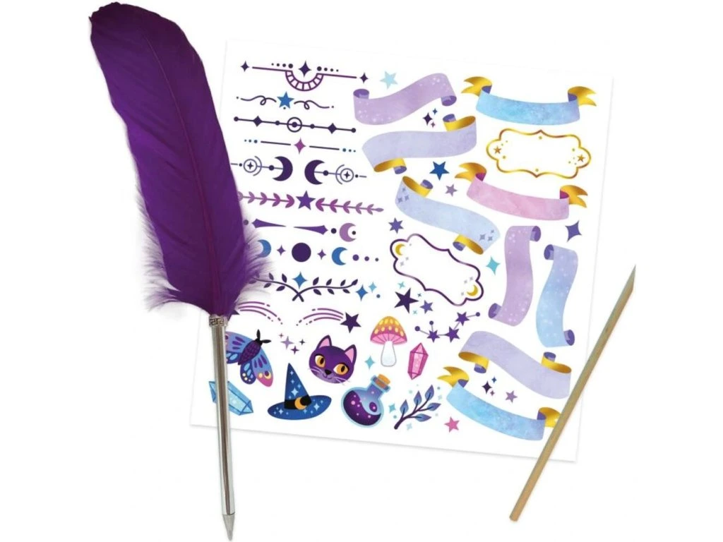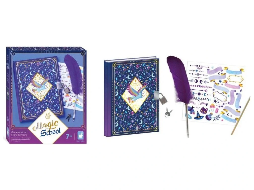 Každý pravý čarodějný učeň potřebuje tajnou knihu kouzel! S touto kreativní sadou pro děti od 7 let jsou tajemství a kouzla dobře zachována! Se svým 96-stránkovým tajným zápisníkem si mohou zapsat ingredience svých čarovných elixírů nebo si nakreslit fantastická stvoření. Není to jen deník, je to ideální tvořivá činnost, jak se vyjádřit neomezeně díky obtlačkovému archu a peru, které jsou součástí balení! Fialové barvy tohoto tajného grimoáru zvou k magii a čarování!