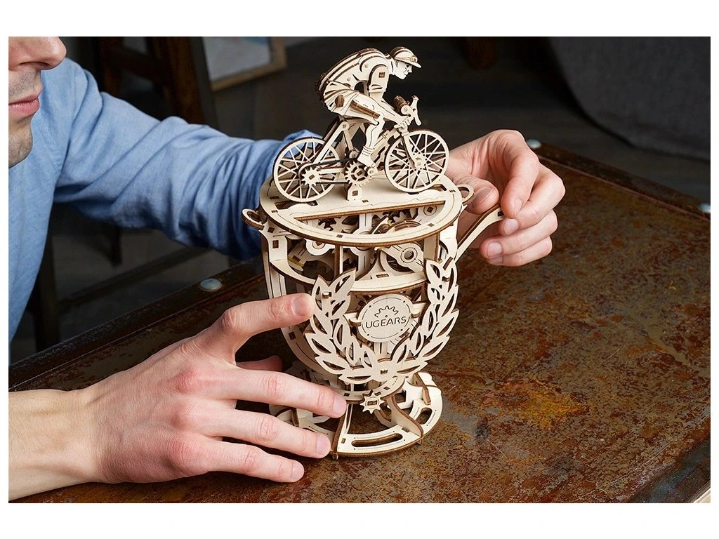 Inspirován klasickými kronikami Tour De France, Cyklista v sobě uchovává ducha soutěže, velkého sportu a ještě většího vítězství. Charakteristický design Ugears dělá z tohoto modelu vynikající exemplář – je zábavné ho skládat a je originálním dekorativním prvkem v každém domě nebo kanceláři. Je to perfektní dárek pro vaši rodinu, přátele a kolegy. Skvělý dárek pro cyklisty, hobby nadšence nebo milovníky DIY.