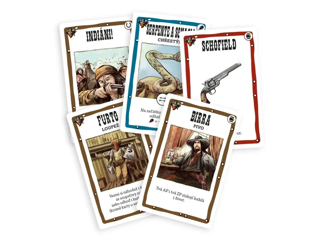 - karty Bang! (červený okraj) – slouží k útoku na soupeřovu aktivní postavu, v jednom tahu je možné zahrát jen jednu