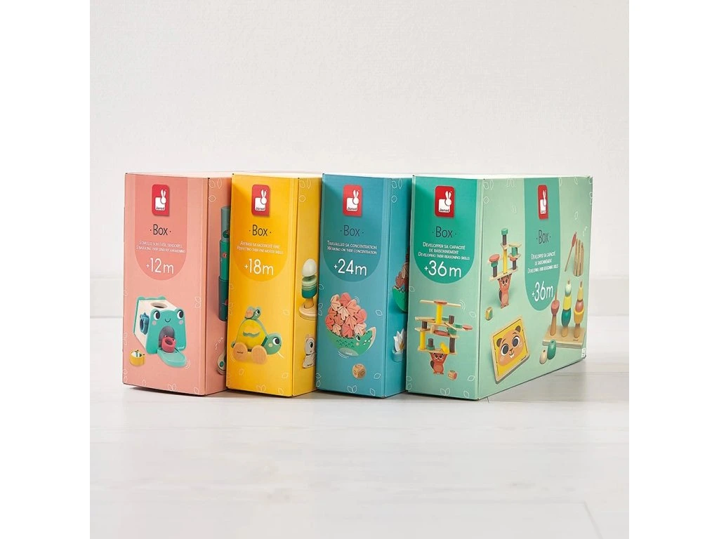 Rozdělení podle věku: Celkově jsou k dispozici 4 Janod boxy pro různé věkové skupiny: od 12 měsíců, od 18 měsíců, od 24 měsíců a od 36 měsíců, aby dítě získalo hračky vhodné jeho vývoji.
