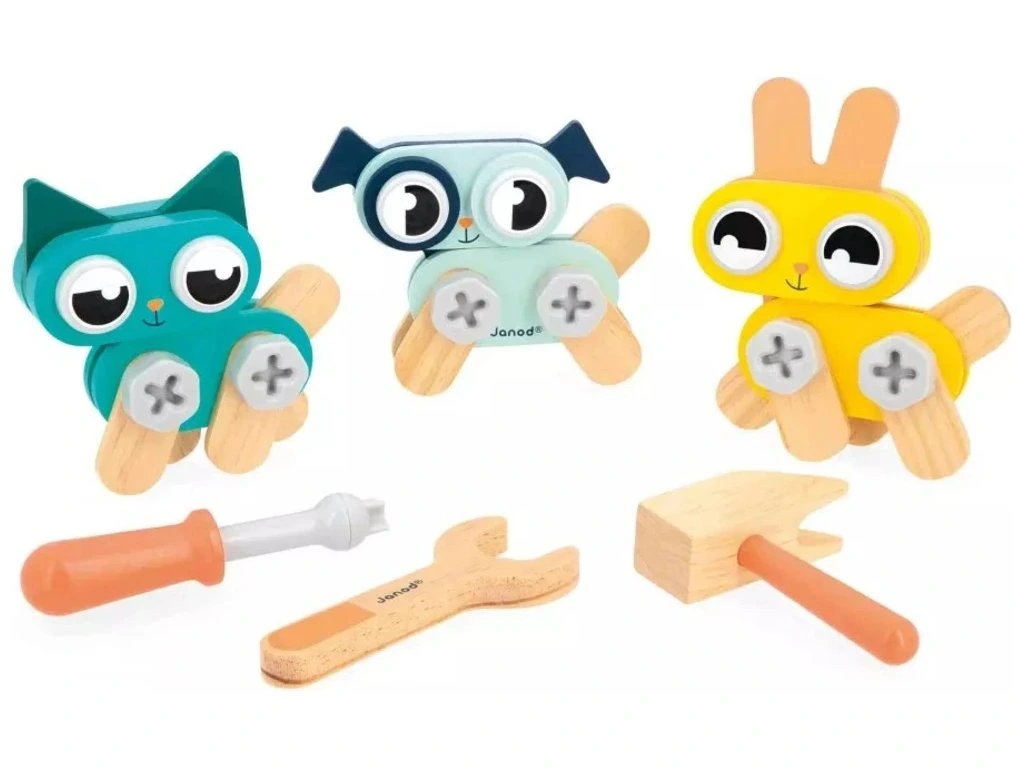 Dřevěná skládací zvířátka Brico'Kids – Janod (3+)Tři roztomilá zvířátka, nekonečné možnosti skládání a zábavy! Dřevěná stavebnice z kolekce Brico'Kids umožní dětem sestavit si vlastního pejska, kočku nebo králíka – nebo rovnou všechna tři najednou. Hračka podporuje jemnou motoriku, logické myšlení, trpělivost i dětskou představivost.
