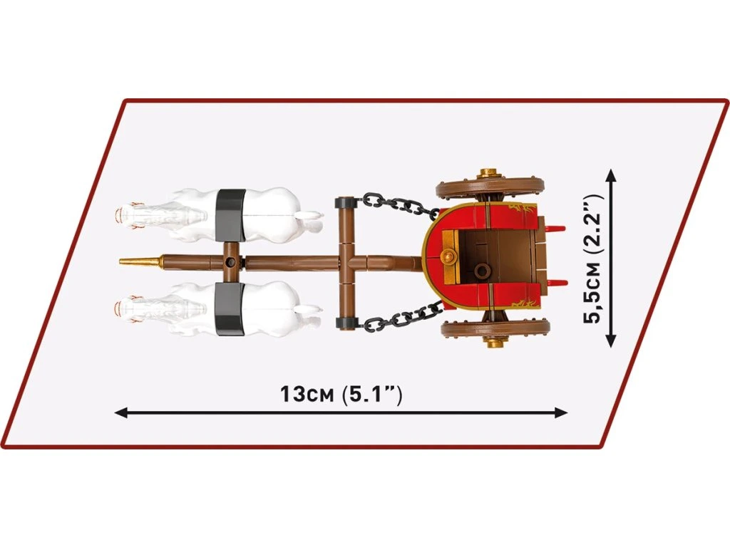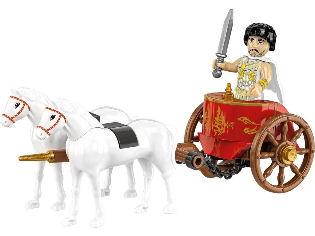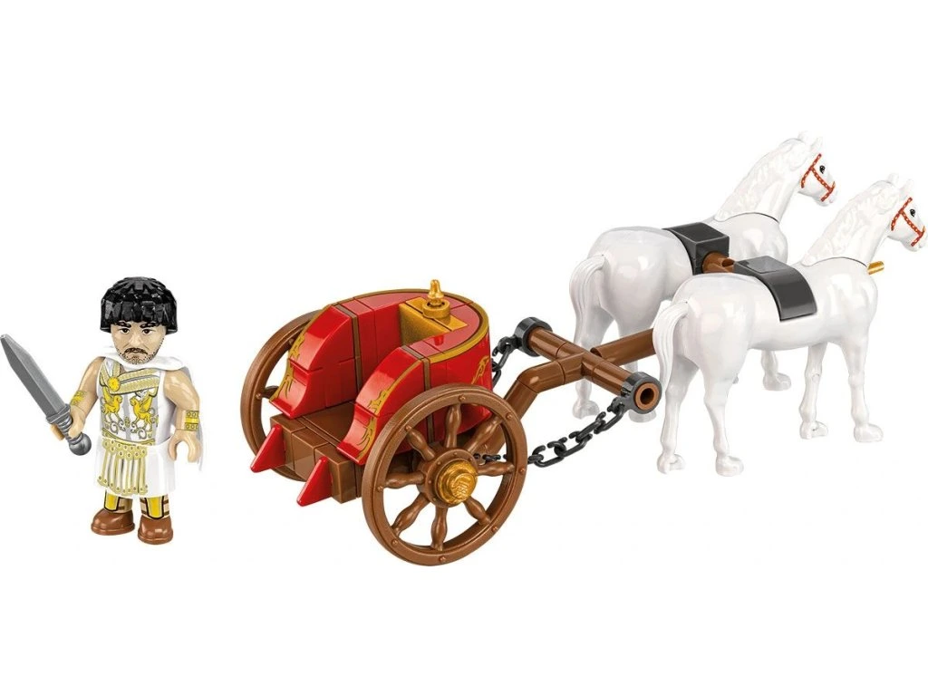 Ve starověkém Římě se vozy používaly především jako reprezentativní dopravní prostředky a nechyběly ani na slavných závodech v hipodromech. Tento model z kostek představuje slavnostní voz zapřažený za dvojici bílých koní, který řídí triumfující generál připravený na slavnostní vstup do Věčného města.