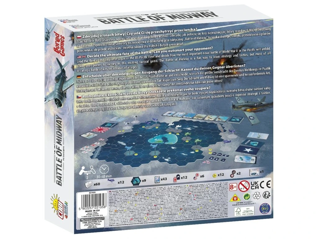 Rozhodněte o konečném osudu bitvy! Dokážete překonat svého protivníka? Vezměte velení flotile Japonského císařství nebo americké tichomořské flotile a určete, jak se bude vyvíjet nejdůležitější námořní bitva 2. světové války v Pacifiku. Veďte svá letadla k vítězství v této vzrušující taktické hře. Bitva o Midway vám zábavným způsobem přiblíží vojenskou strategii a taktiku, ale především jde o epickou bitvu důvtipu pro admirály všech věkových kategorií!