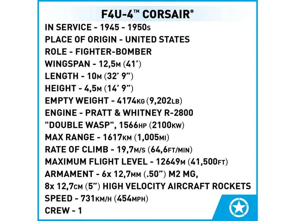 Postavte si model Vought AU-1™ Corsair®, stíhacího letadla amerického námořnictva. Tento legendární „Corsair" byl vyráběn v letech 1942 – 1952 společností Vought-Sikorsky Aircraft. Do služby vstoupil v roce 1942 a vynikal charakteristickým tvarem lomených křídel, kokpitem posunutým dozadu a vrtulí s průměrem více než 4 metry. Corsair byl využíván až do nástupu proudových letadel a aktivně se účastnil korejské války, kde sloužil především jako podpůrné letadlo. Písmeno „A" v označení znamenalo právě podpůrné letadlo. Stroje byly vyzbrojené čtyřmi 20 mm kanóny na křídlech a měly háky pro zavěšení raket a bomb, přičemž maximální bojová zátěž byla přibližně 1 815 kg.