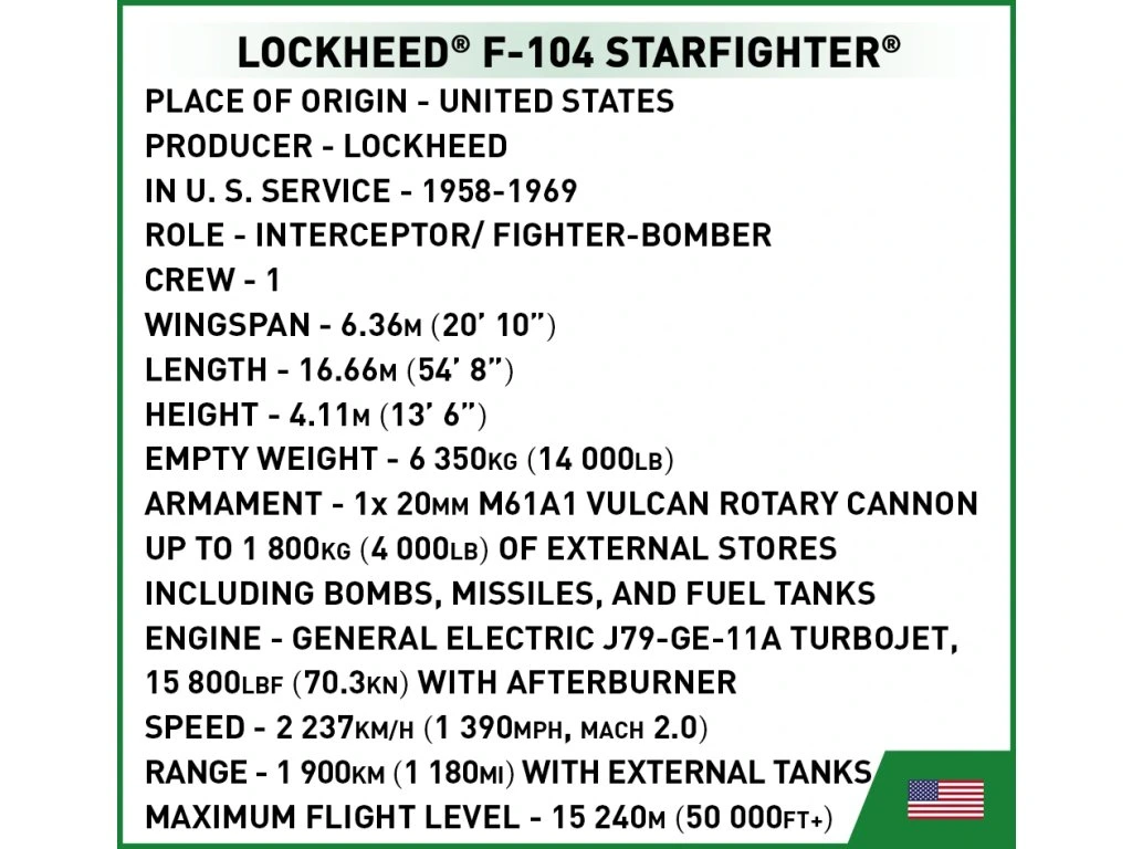 Postavte si model legendární vietnamské stíhačky F-104 Starfighter od COBI. Sada Lockheed F-104 STARFIGHTER v měřítku 1:48 vám umožní sestavit přesnou repliku stíhačky, která sloužila jako krytí pro ostatní letadla a účinný odstrašující prostředek pro stíhačky MiG. F-104 byl prvním sériově vyráběným letadlem, které dosáhlo více než dvojnásobek rychlosti zvuku. Licenčně se vyráběl v šesti zemích NATO a používalo ho 14 letectev po celém světě.