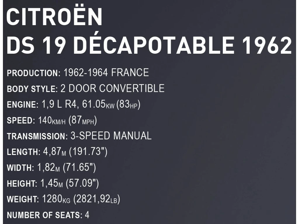 Postavte si legendární Citroën DS 19 Décapotable – klasický kabriolet a symbol luxusu a prestiže! Tento model v provedení EXECUTIVE EDITION věrně reprodukuje ikonický francouzský automobil v měřítku 1:12. Po sestavení měří impozantních 39,5 cm na délku a obsahuje více než 2 200 kostiček stavebnice.