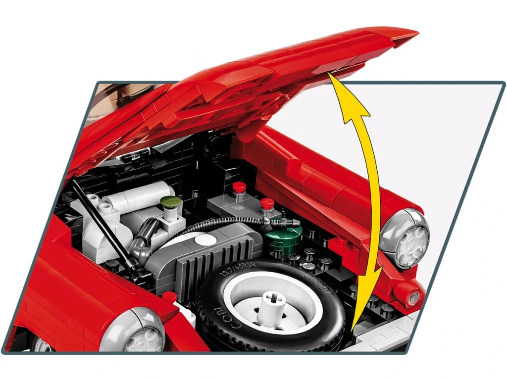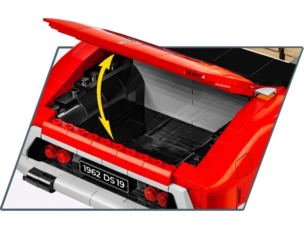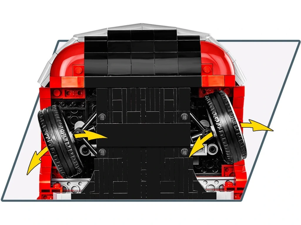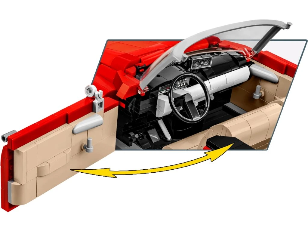 Objevte krásný interiér, palubní desku, funkční volant, otočná kola, otevírací dveře i kufr. Pod kapotou se nachází detailní motor postavený z kostiček. Auto má nádhernou červenou karoserii a sada obsahuje stojan na vystavení modelu s plaketu s názvem vozidla.