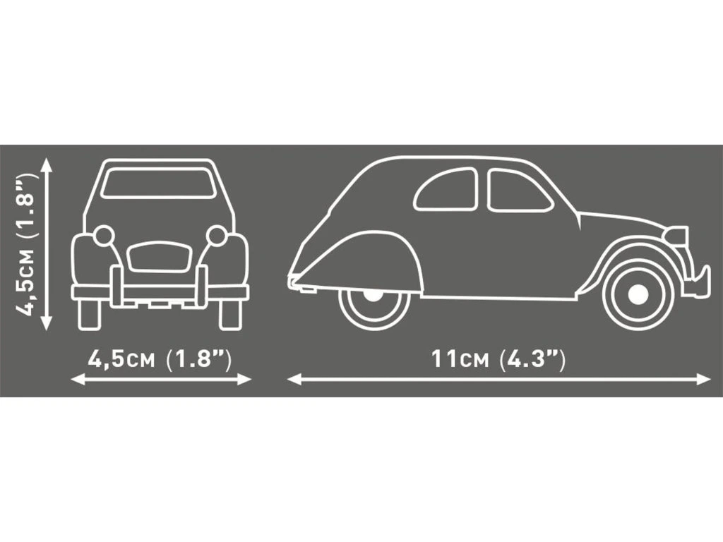 Postavte si model legendárního francouzského vozidla Citroën 2CV Type A v měřítku 1:35. Model je vyvedený ve světle šedé barvě a přední světla jsou z kostek, které svítí ve tmě. Sestavený model má délku 11 cm, šířku 4,5 cm a výšku 4,5 cm.