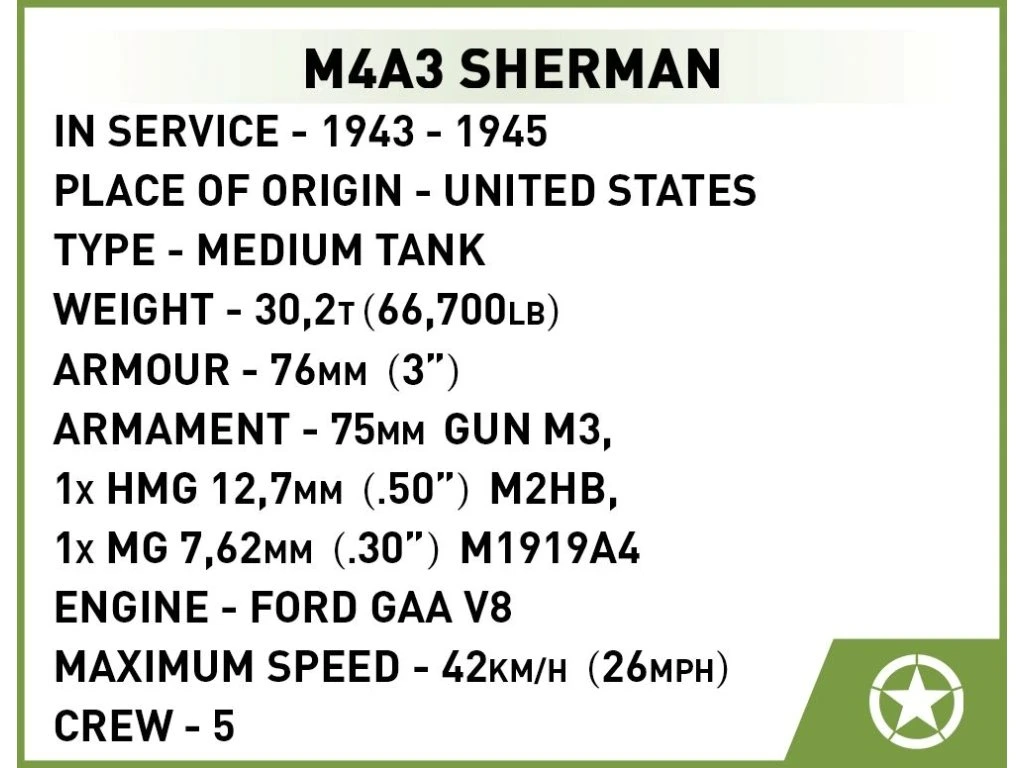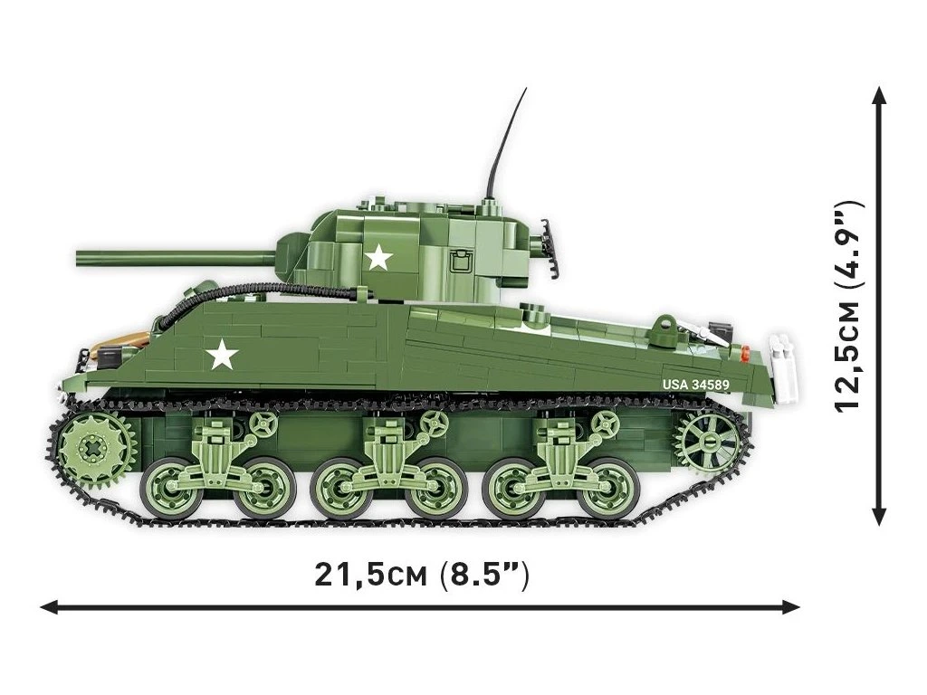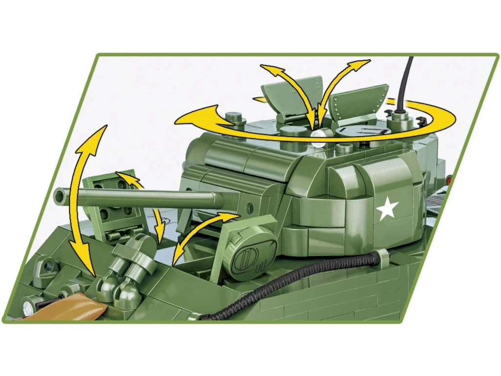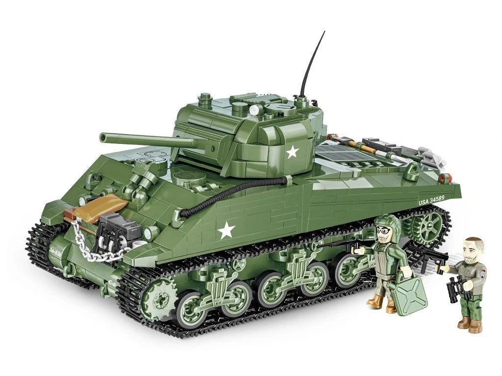 Postavte si model M4 Sherman, hlavního amerického středního tanku z 2. světové války. Vyráběný v letech 1942 – 1945 se stal nejznámějším americkým tankem. Tank byl vybaven 75 mm kanónem. Munice a hořlavý motor dělaly ze Shermanů na začátku lehký cíl pro těžší německé tanky.