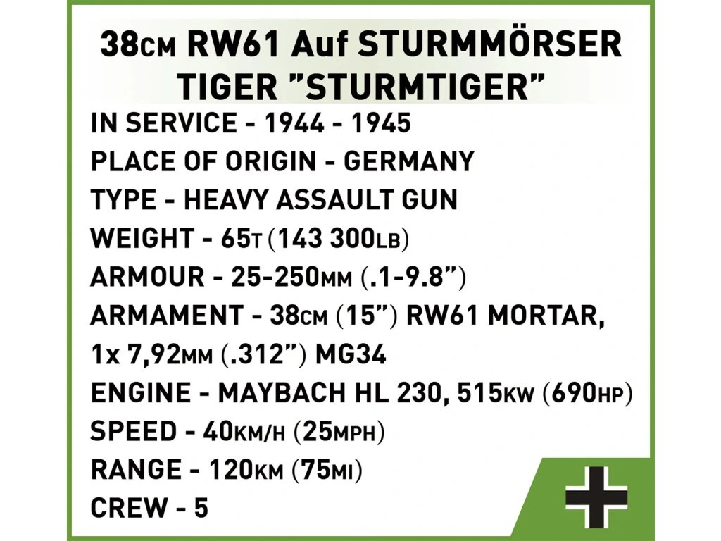 Sturmtiger bylo německé obrněné dělo z 2. světové války. Náš model byl navržený v měřítku 1:28 a skládá se z 1100 vysoce kvalitních prvků. Po sestavení měří vozidlo 23 cm na délku a obsahuje množství poutavých detailů. Kostičky mají odolné potisky zobrazující označení a charakteristické detaily vozidla.
