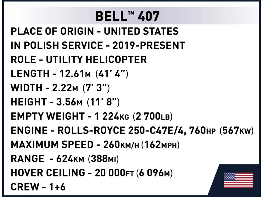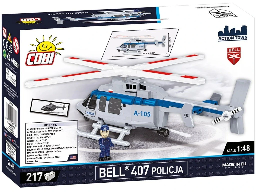 Tento moderní víceúčelový vrtulník, vybavený špičkovou technologií a vynikající manévrovatelností, je součástí výbavy polské policie. Bell 407 si hravě poradí v náročných podmínkách, ve dne i v noci, díky kompaktním rozměrům a moderním technologiím. Nyní si můžete postavit věrnou repliku tohoto stroje, jak ho můžeme vidět na polské obloze.