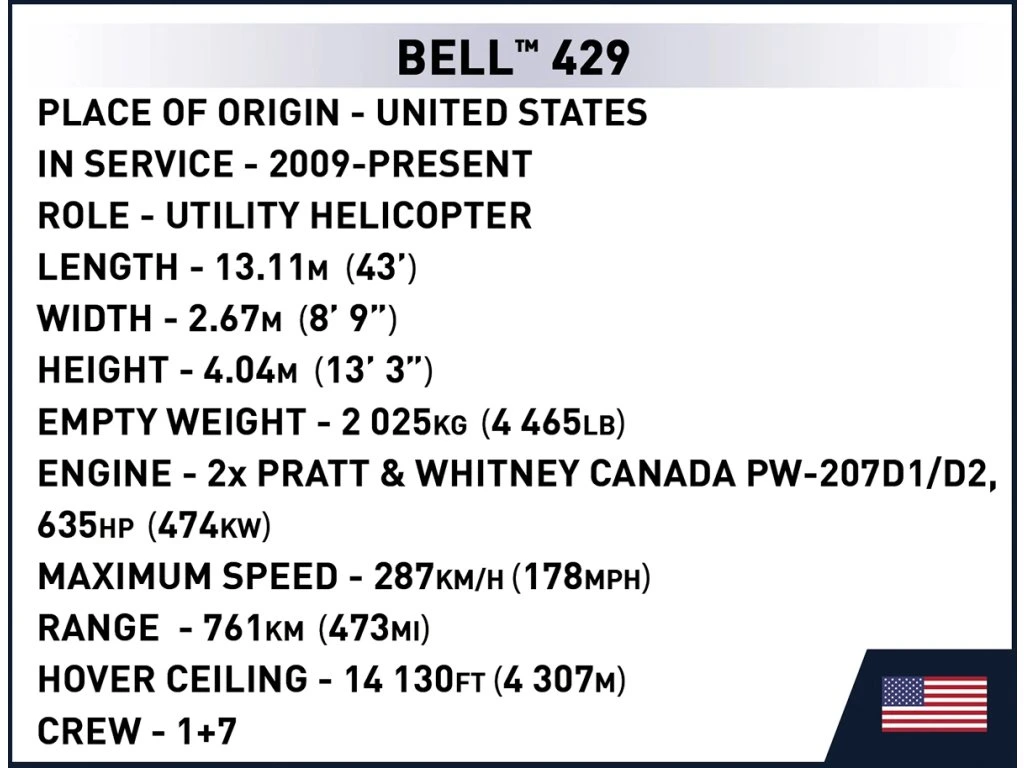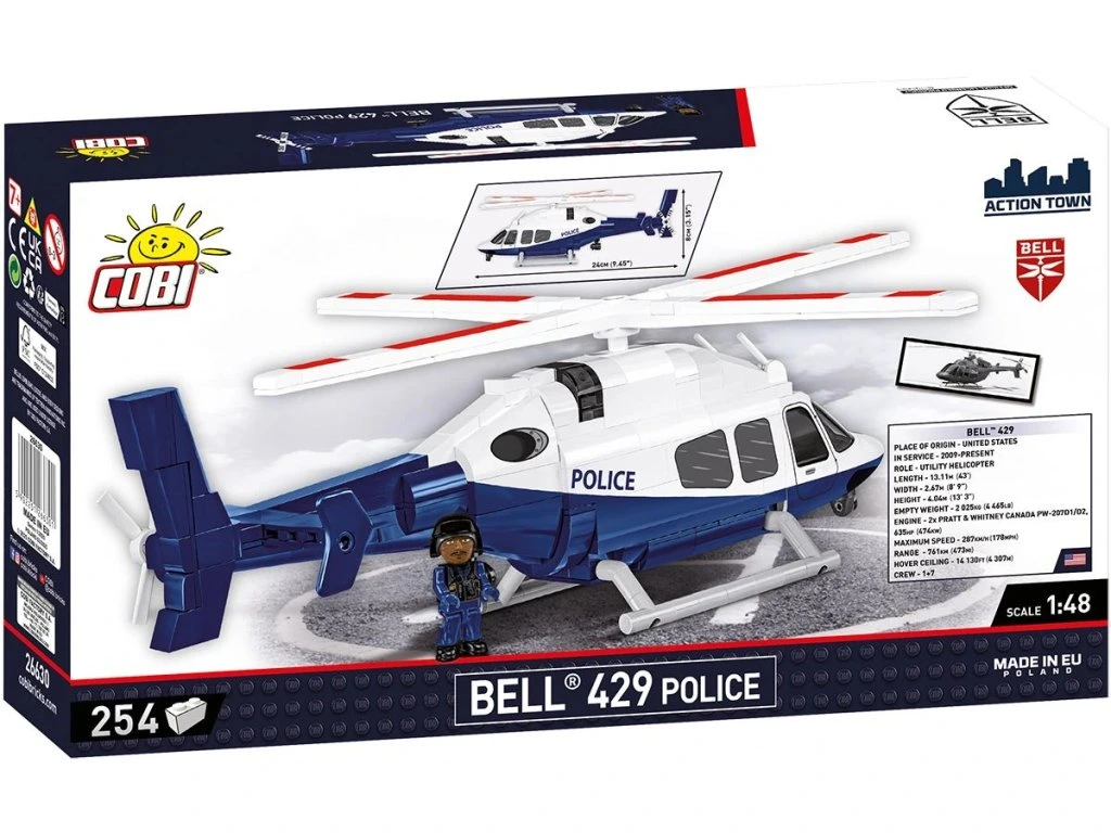 Stavebnice v měřítku 1:48 umožňuje postavit model vrtulníku, který používají policejní složky po celém světě. Bell 429 vyniká rychlostí, doletem a skvělými letovými vlastnostmi při vznášení. Ideálně se hodí na záchranné mise, pronásledování a letecké konvoje.