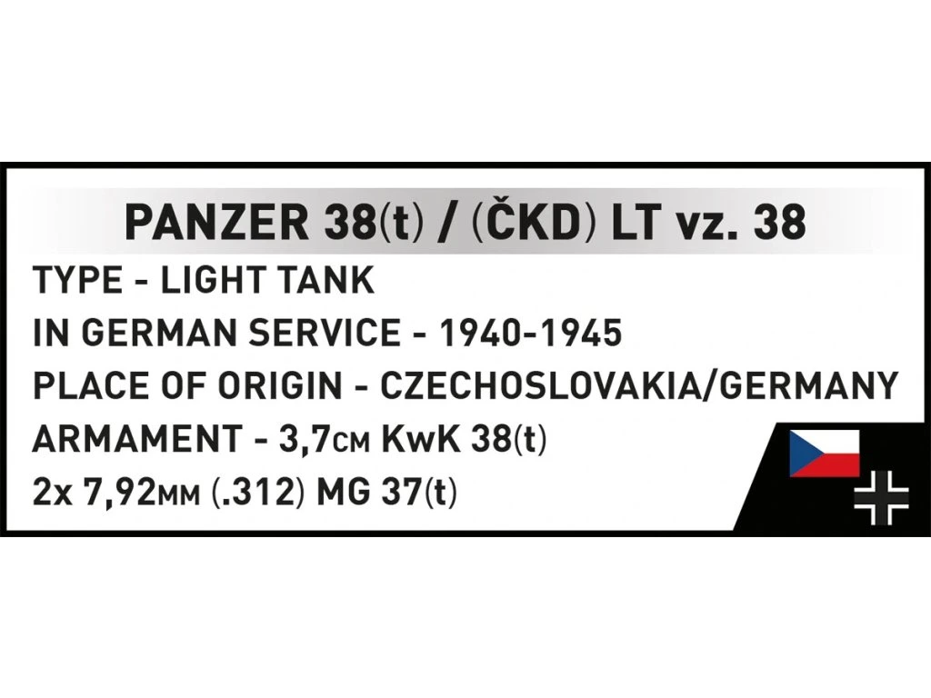 LT vz. 38, vyvinutý továrnou ČKD v roce 1935, se vyznačoval moderním designem, spolehlivostí a pevným pancéřováním. Po německé okupaci Československa ho převzal Wehrmacht a přejmenoval na Panzerkampfwagen 38(t). Tank se osvědčil v tažení 1939-1940, jeho podvozek byl základem pro množství dalších bojových vozidel. Zajímavost: tento model obsahuje slovenskou trikolóru, která odráží označení tanků během Slovenského národního povstání.