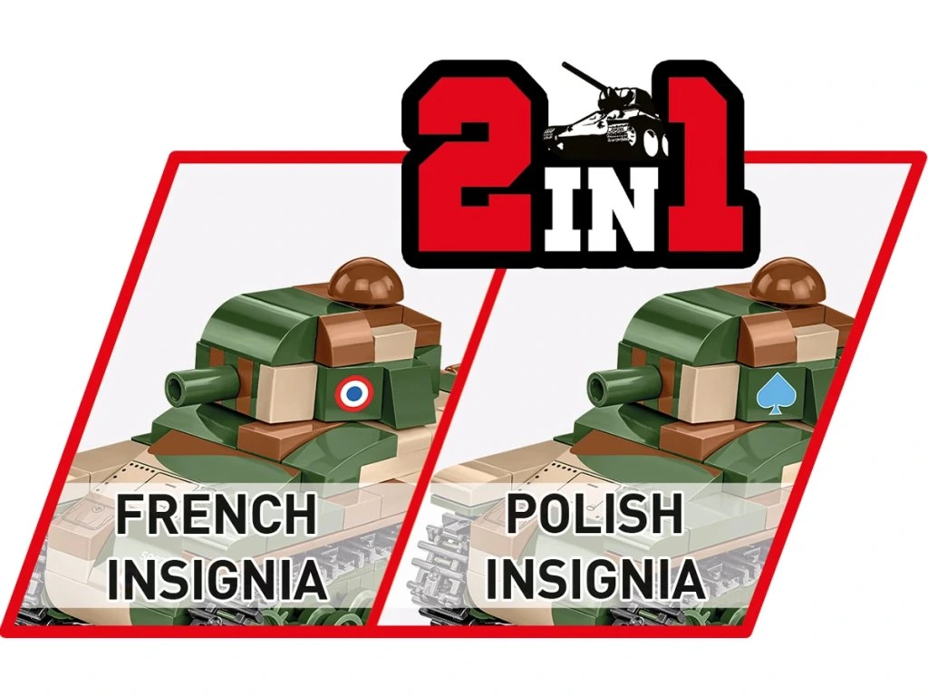 Model, reprodukovaný v měřítku 1:48, je možné postavit z 258 dílků. Pohyblivá pásová trakce, otočná věž, historizující potisky, dvojité polské a francouzské insignie a prvky prostředí (fragment plotu, strom, vegetace) dělají z této sady ideální model na hraní i na vystavení. Jasný a intuitivní návod provede stavitele všemi fázemi stavby. Vysoce kvalitní a odolné potisky zvyšují estetiku modelu. Postavte si historii, kostka po kostce!