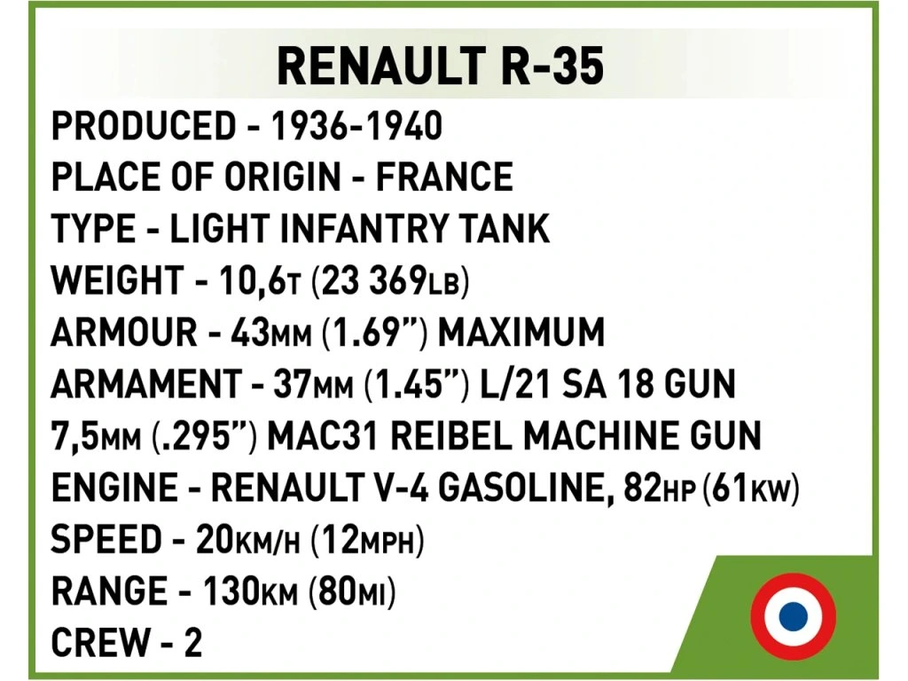 Postavte si model Renault R-35 – populárního francouzského lehkého pěchotního tanku (Char légère model 1935R) z raného období 2. světové války. R-35 byl nástupcem starobylého tanku Renault FT-17 z 1. světové války. Polsko zakoupilo od Francie 100 tanků Renault R-35. V červenci 1939 dorazila první várka přibližně 50 kusů. Používaly se v září 1939. Tváří v tvář porážce byly některé stroje odeslány do Rumunska a Maďarska. Transport dalších 50 kusů se do Polska nedostal.