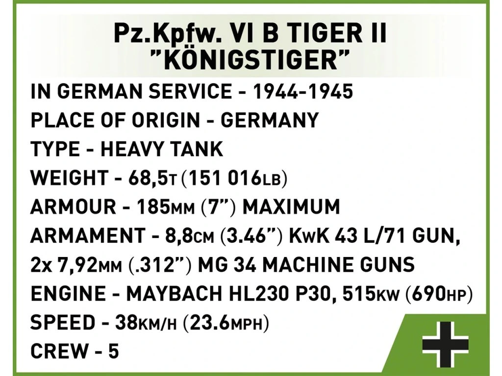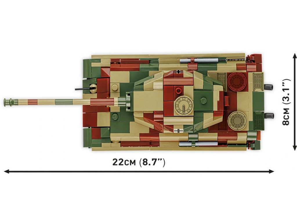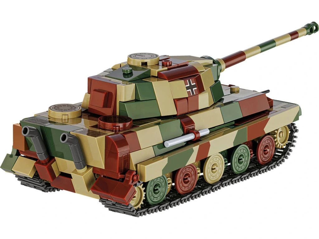 Model tanku Tiger II je sestaven z 500 vysoce kvalitních dílků stavebnice COBI. Každý prvek je navržen s důrazem na přesnost a historické detaily – od šikmého pancéřování po výfukové trubky, věž s otočným dělem a realistický vzor pásů.
