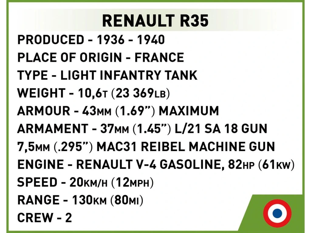 - Renault R35: Délka 9 cm × Výška 5,5 cm
