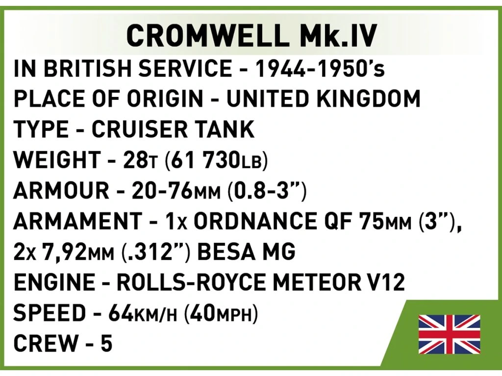 Postavte si model britského středního tanku Cromwell Mk. IV z 2. světové války! Tank byl uveden do služby v roce 1944 a používala ho především britská obrněná jednotka, stejně jako 1. polská obrněná divize („Černí ďáblové") během bojů na Západě. Byl známý svou rychlostí a obratností na bojišti.