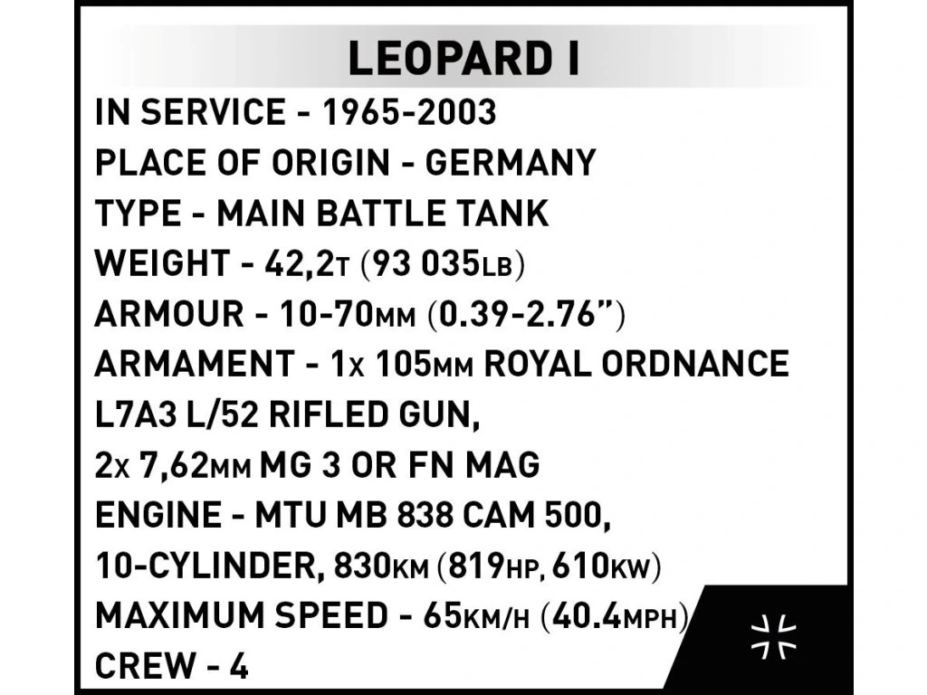 Postavte si model německého středního tanku Leopard I v měřítku 1:72! Leopard I byl hlavním bojovým tankem druhé generace vyvinutým v 60. letech 20. století. Sloužil v Bundeswehru a mnoha dalších armádách NATO a stal se symbolem německé obrněné síly. V některých armádách je stále v službě, ačkoli ho postupně nahrazují modernější tanky.