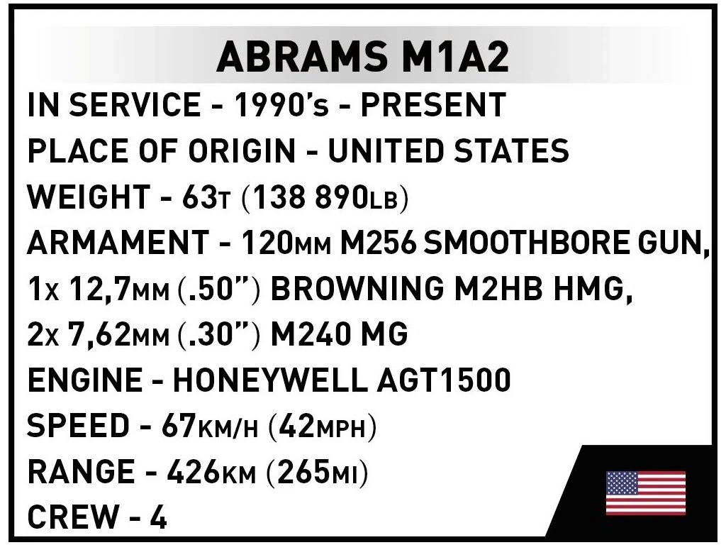Postavte si model amerického středního tanku M1A2 Abrams v měřítku 1:72! M1A2 Abrams je hlavní bojový tank třetí generace vyvinutý v USA v 80. letech 20. století. Je nástupcem tanku M1 Abrams a patří mezi nejmodernější tanky světa. Tank se zúčastnil bojů ve válce v Perském zálivu, válce v Afghánistánu a v dalších konfliktech.
