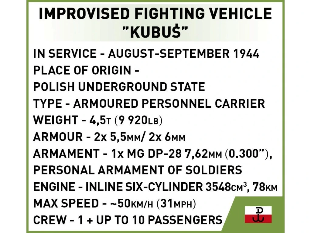 Postavte si model obrněného vozidla „Kubuś" v měřítku 1:35! Tento unikátní obrněný automobil vzdává hold hrdinům Varšavského povstání z roku 1944. Model byl připraven při příležitosti 80. výročí této významné události a umožňuje poznat odvahu a vynalézavost povstalců.