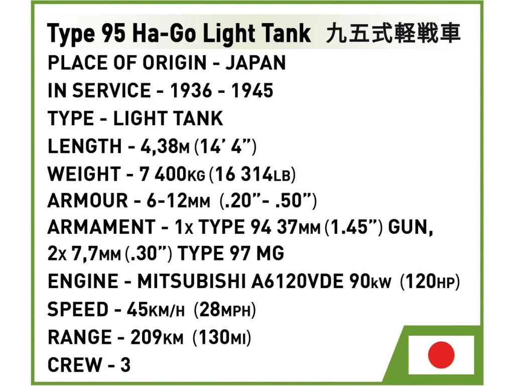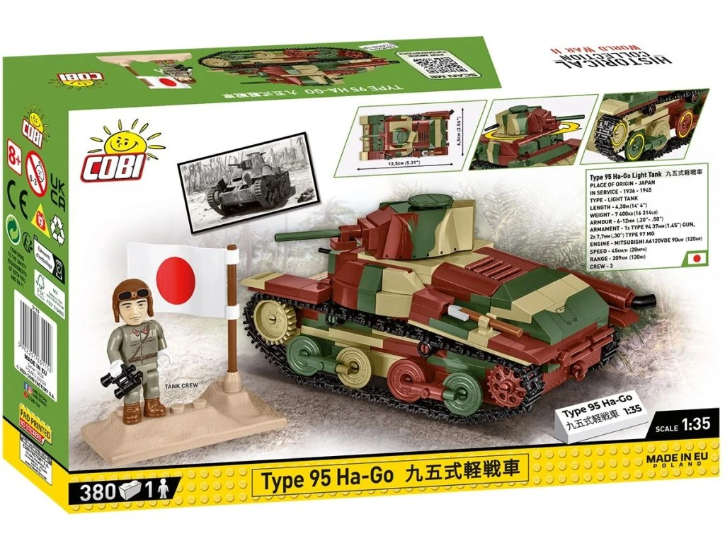 Postavte si model japonského lehkého tanku Typ 95 Ha-Go v měřítku 1:35! Jde o první model japonského vozidla v sérii Historical Collection od COBI. Typ 95 Ha-Go byl hlavním lehkým tankem Japonské císařské armády během 2. světové války a zúčastnil se významných bojů na Filipínách, v Barmě a na Guadalcanalu.