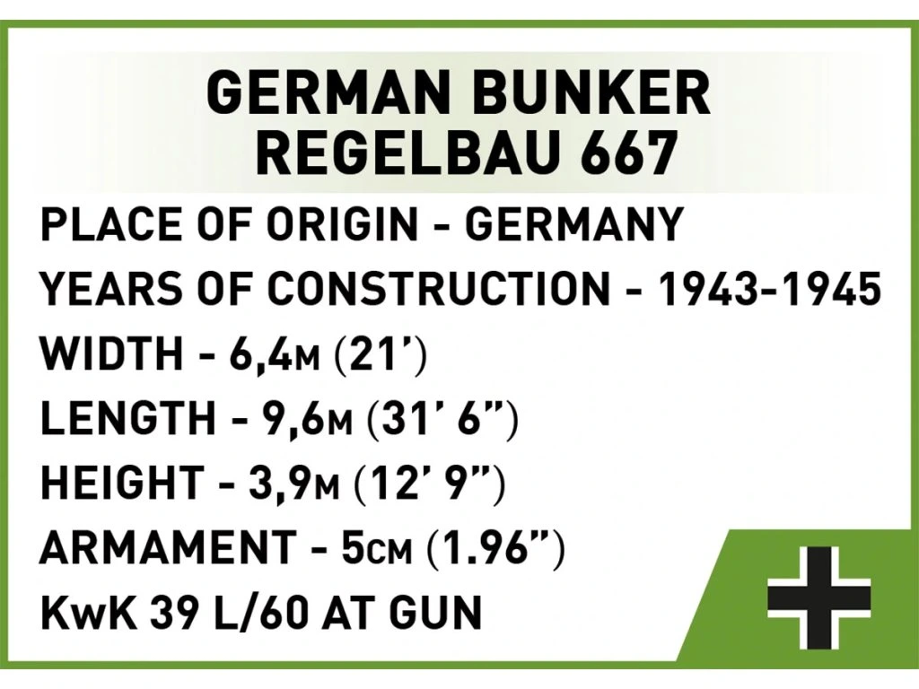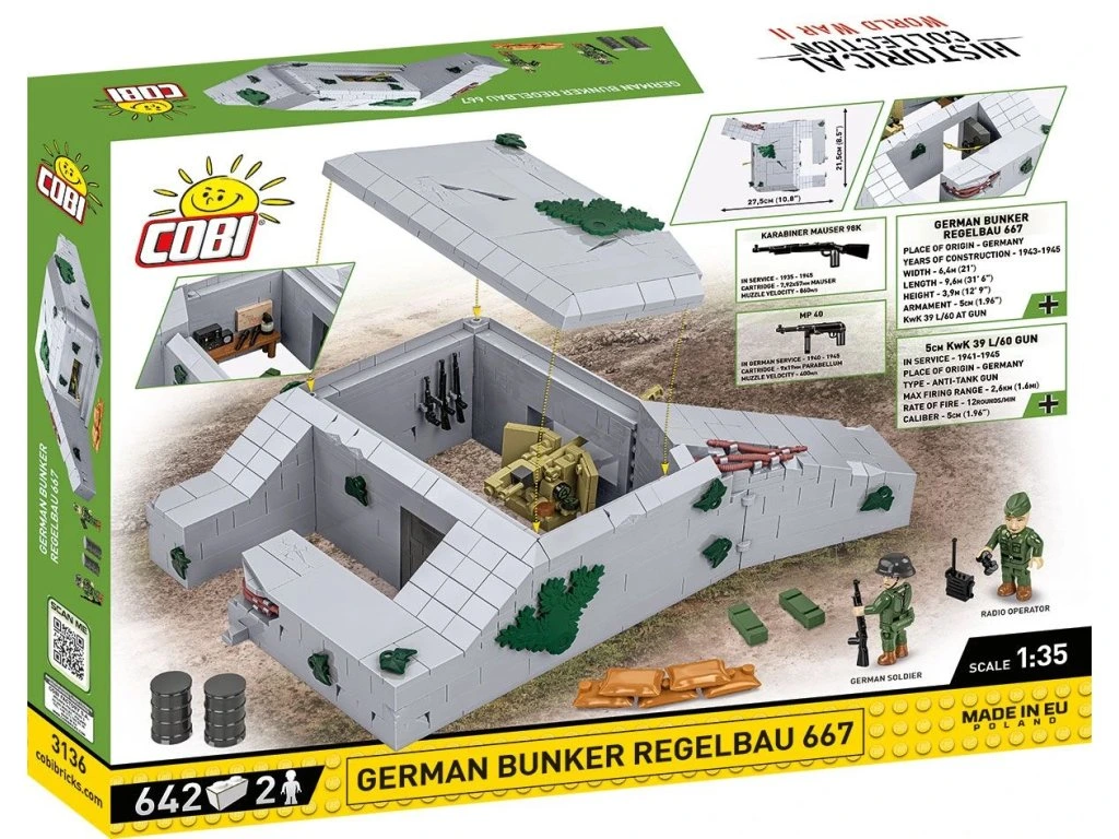 Vstupte do světa vojenských opevnění a postavte si bunkr Regelbau 667 – objevte tajemství Atlantického valu! S modelem Regelbau 667 od COBI spojíte zábavu se zájmem o historii. Jde o autentickou repliku německého bojového bunkru, který chránil vojáky a techniku před spojeneckým útokem. Pevné železobetonové stěny byly součástí strategické obrany Třetí říše a účinně odolávaly bombardování i dělostřelecké palbě. Obsah sady:- 642 vysoce kvalitních kostek stavebnice