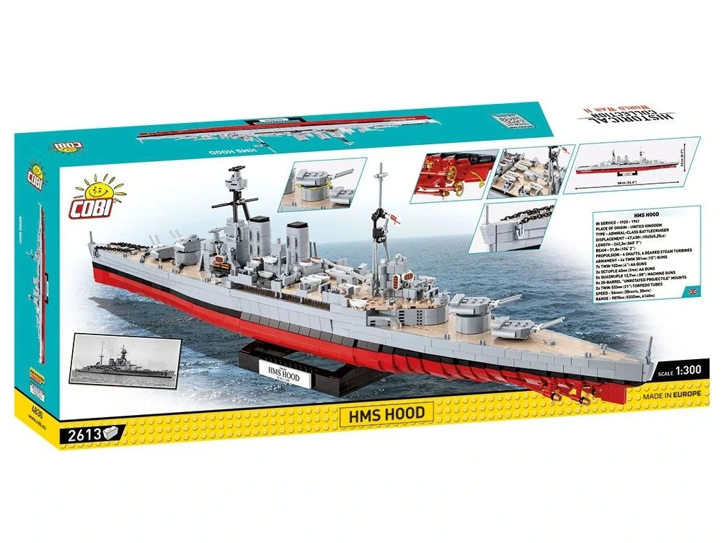 Model HMS Hood od COBI je navržen v měřítku 1:300 a věrně zobrazuje detaily historické předlohy. Model je 88 cm dlouhý a 22 cm vysoký a obsahuje množství pohyblivých prvků, jako jsou palubní děla, otočné dělostřelecké věže, kormidla a lodní šrouby. Vyniká kvalitními potisky zobrazujícími vybavení a kamufláž, které se neotírají ani při intenzivní hře. Sada obsahuje černý stojan a bílou plaketu s názvem lodi a měřítkem modelu.