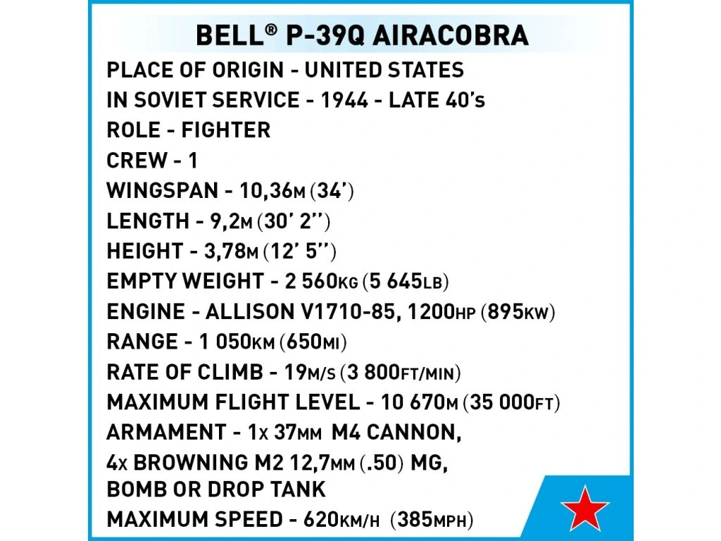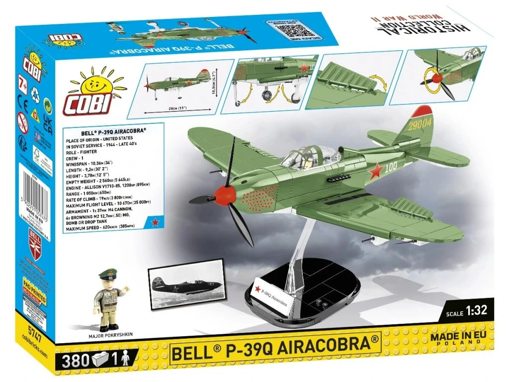 BELL® P-39Q AIRACOBRA® je navržen ze 380 kostek stavebnice COBI v měřítku 1:32. Model nabízí množství pohyblivých prvků, jako je otočná vrtule, pohyblivé křidélka a kola s gumovými pneumatikami, která je možné sklopit do vodorovné polohy. Kokpit je otvíratelný a umožňuje usadit historickou figurku pilota do sedadla.
