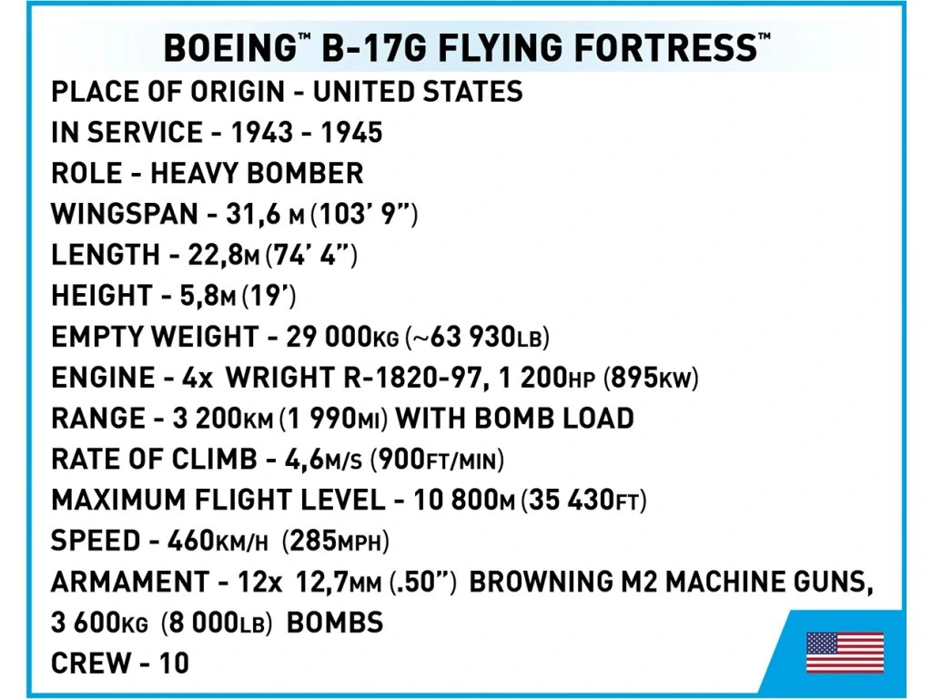 B-17F je nezbytnou součástí pro všechny nadšence historie, letectví a vojenské techniky. Velké množství dílků poskytuje mnoho hodin vzrušujícího stavění.