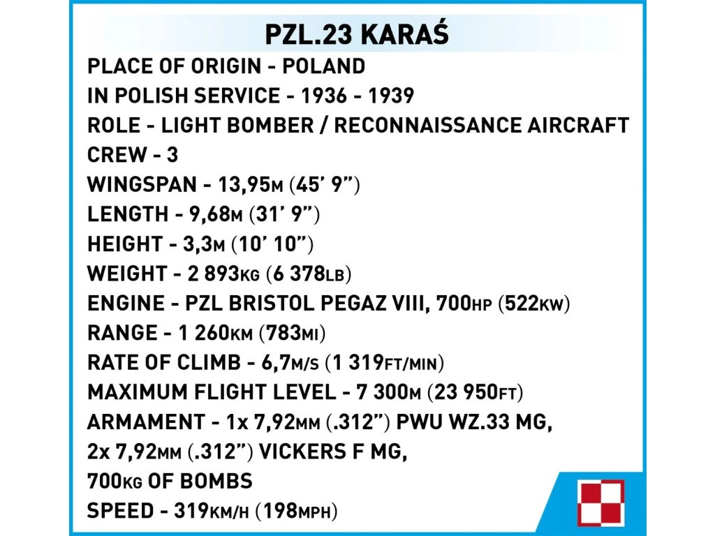 Letadlo má natištěné historické značení, které je i na spodní straně křídel. Spodní část letadla je vyrobena z nových světle modrých kostek. Kromě kulometů je PZL.23 Karaś vybaven sadou připínacích bomb. Figurky letců v charakteristických kožených oblecích mají potisky i na zádech a vypadají fantasticky.