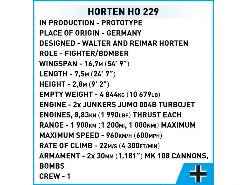 Sada Horten Ho 229 umožňuje postavit stroj, který spojuje moderní technologii s fascinující historií. Vysoká kvalita komponentů a důraz na detaily dělají tento model skvělou ozdobou každé police nebo kanceláře.