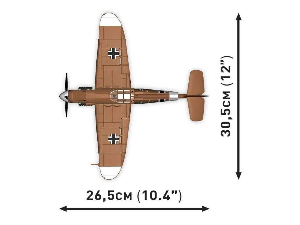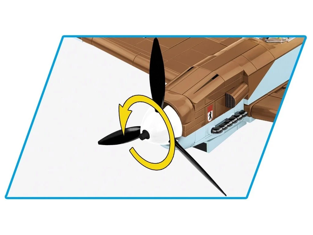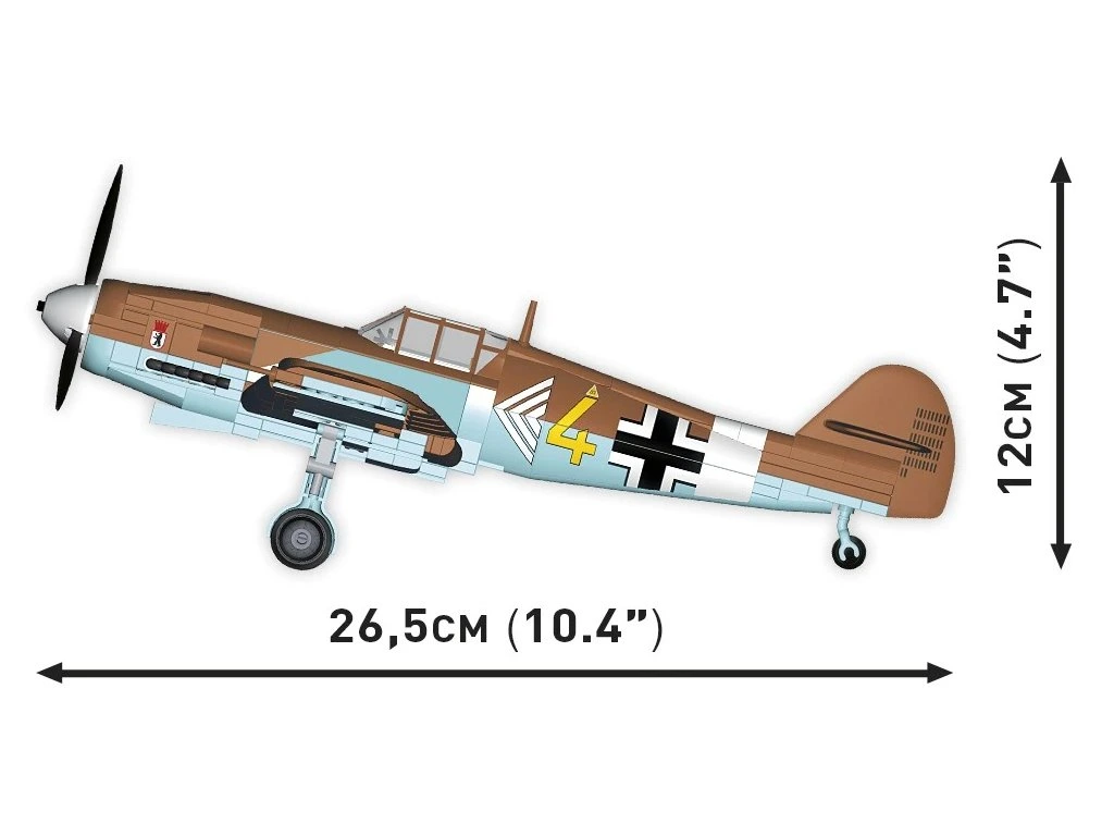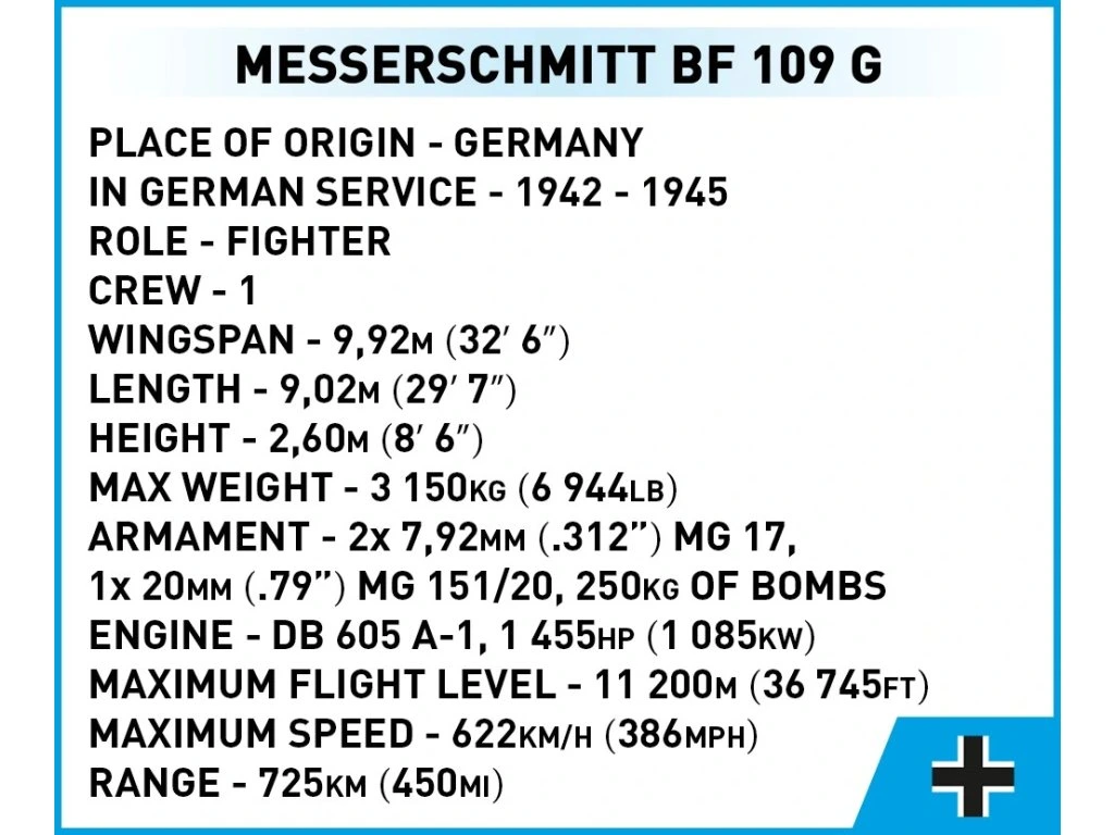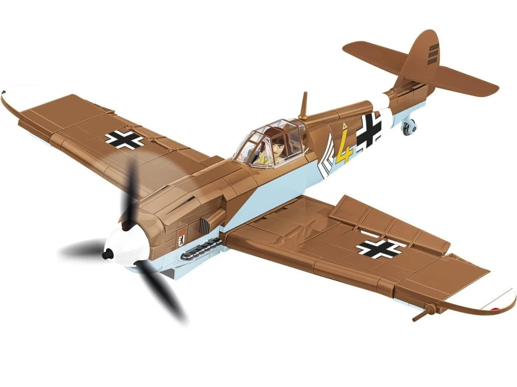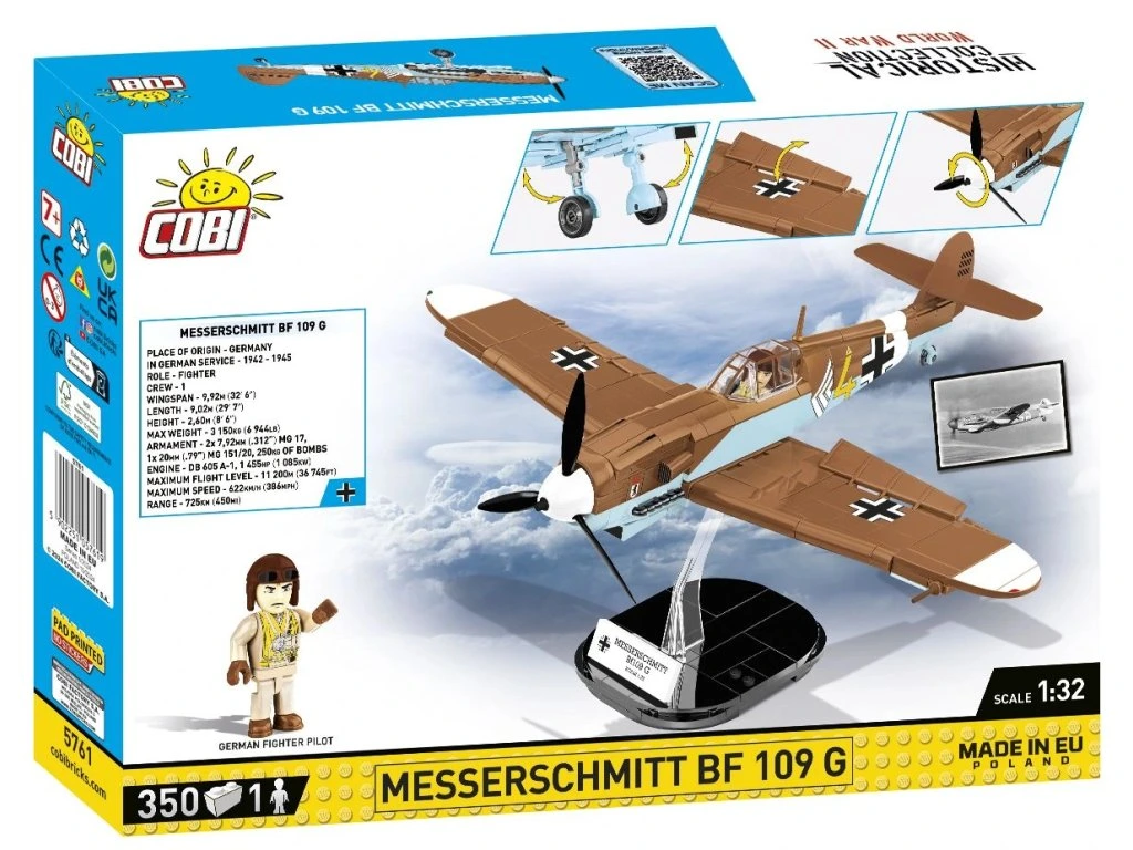 Messerschmitt Bf 109 G, známý také jako "Gustav", byl německý stíhací letoun z 2. světové války. Model je velký a obsahuje množství detailů reprodukovaných pomocí 350 kostiček stavebnice COBI. Letoun má pohyblivou vrtuli a kormidla. Jeho otočná kola s gumovými pneumatikami je možné vysunout na podvozku do vzletové nebo přistávací polohy. Kabinu pilota je možné otevřít a umístit do ní figurku pilota. Letoun je pokryt vysoce kvalitními potisky, které se ani při intenzivním hraní neotírají. Sada je 100% bez samolepek. Potisky zobrazují tropický nátěr a vybavení letounu z období války. Součástí sady je také speciální stojan, který zvyšuje atraktivitu modelu, a plaketka s názvem letounu.