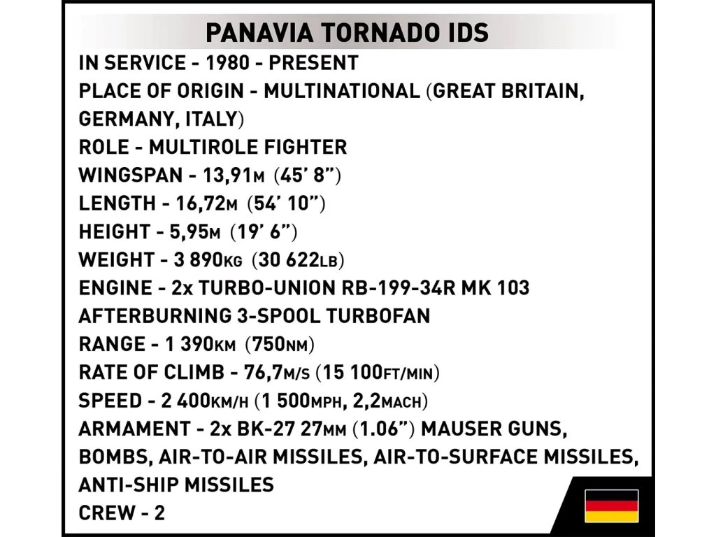 Sada Panavia Tornádo IDS od COBI umožňuje postavit model německé verze legendární stíhačky! S touto stavebnicí si můžete vytvořit německou verzi víceúčelové stíhačky Panavia Tornádo IDS – legendárního bojového letadla, které se stalo symbolem evropského obranného průmyslu.
